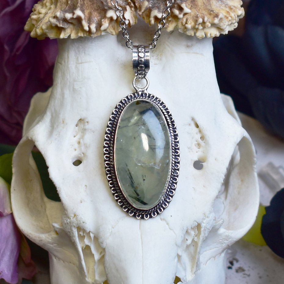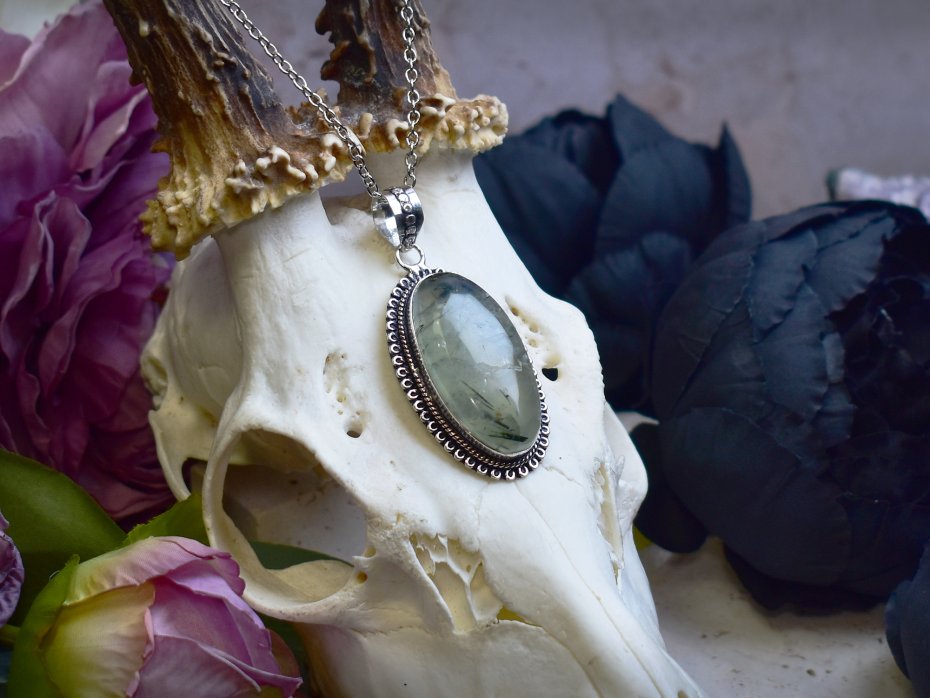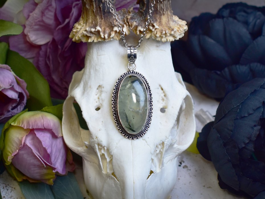 Miedziany wisiorek pokryty srebrem próby 925, wykonany tradycyjnymi metodami rzemieślniczymi, ozdobiony prehnitem – kamieniem o delikatnej, zielonej barwie z subtelnym, naturalnym połyskiem. Prosta, minimalistyczna oprawa pozwala w pełni podkreślić naturalne piękno kamienia, tworząc elegancki i ponadczasowy projekt. Prehnit jest kamieniem harmonii, wspierającym spokój umysłu, równowagę emocjonalną i wewnętrzną jasność. Połączenie stonowanego odcienia kamienia z srebrnym wykończeniem nadaje wisiorkowi subtelny, klasyczny charakter. To idealna propozycja dla osób ceniących rękodzieło, minimalistyczną biżuterię i naturalne kamienie szlachetne.