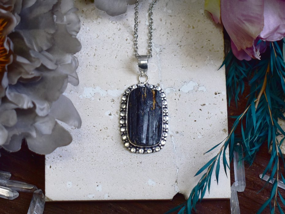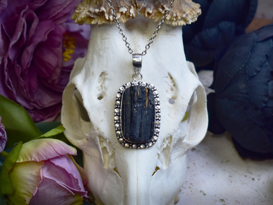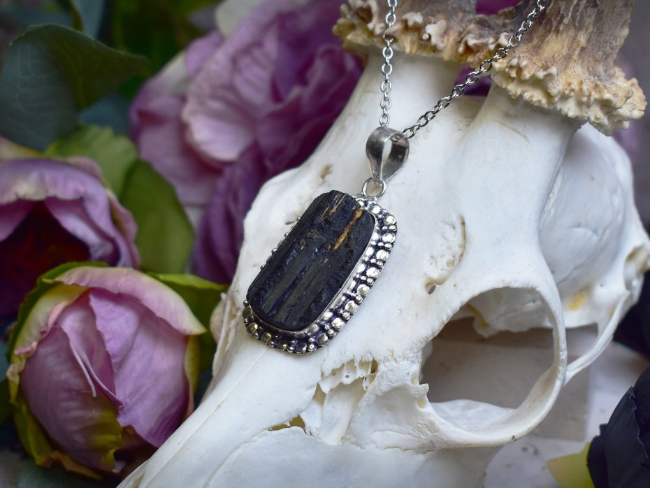 Miedziany wisiorek pokryty srebrem próby 925, wykonany tradycyjnymi metodami rzemieślniczymi, ozdobiony turmalinem o surowym, naturalnym charakterze. Kamień przyciąga uwagę swoją nieregularną strukturą oraz głęboką, intensywną barwą, dzięki czemu każdy egzemplarz jest unikatowy. Prosta, klasyczna oprawa podkreśla autentyczne piękno minerału, nadając biżuterii wyważony i ponadczasowy wygląd. Turmalin kojarzony jest z ochroną, stabilnością i równowagą energetyczną, wzmacniając poczucie bezpieczeństwa i wewnętrznej siły. Połączenie surowej formy kamienia z chłodnym, srebrzystym wykończeniem miedzi tworzy elegancki wisiorek o subtelnie mistycznym charakterze, idealny dla osób ceniących minimalizm i naturalne kamienie.