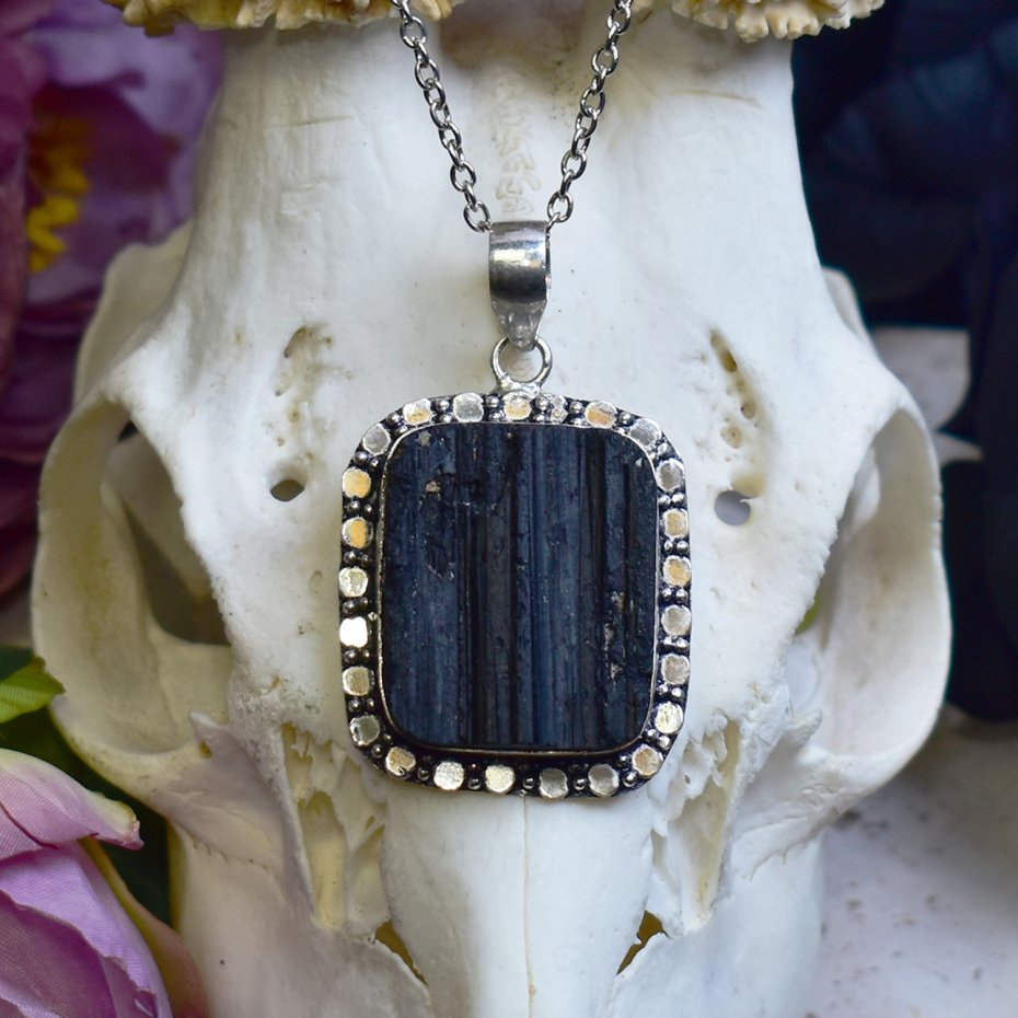 Miedziany wisiorek pokryty srebrem próby 925, wykonany tradycyjnymi metodami rzemieślniczymi, ozdobiony turmalinem o surowym, naturalnym charakterze. Kamień przyciąga uwagę swoją nieregularną strukturą oraz głęboką, intensywną barwą, dzięki czemu każdy egzemplarz jest unikatowy. Prosta, klasyczna oprawa podkreśla autentyczne piękno minerału, nadając biżuterii wyważony i ponadczasowy wygląd. Turmalin kojarzony jest z ochroną, stabilnością i równowagą energetyczną, wzmacniając poczucie bezpieczeństwa i wewnętrznej siły. Połączenie surowej formy kamienia z chłodnym, srebrzystym wykończeniem miedzi tworzy elegancki wisiorek o subtelnie mistycznym charakterze, idealny dla osób ceniących minimalizm i naturalne kamienie.