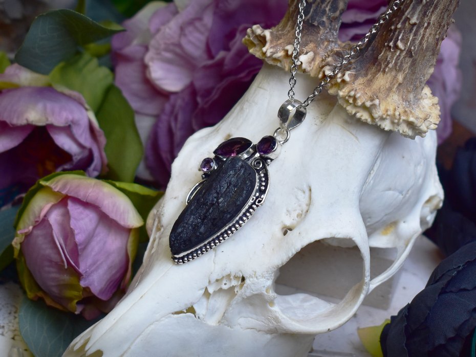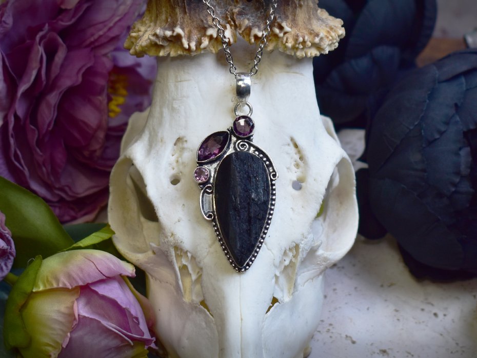Miedziany wisiorek wykonany tradycyjnymi metodami rzemieślniczymi, ozdobiony dużym, surowym czarnym turmalinem oraz dwoma drobnymi ametystami umieszczonymi nad kamieniem głównym w formie delikatnych, listkowatych akcentów. Surowa struktura turmalinu nadaje wisiorkowi mocny, pierwotny charakter, podkreślając naturalne piękno minerału i jego niepowtarzalność. Kontrast pomiędzy głęboką czernią kamienia a subtelnymi, fioletowymi akcentami ametystów tworzy harmonijną, a zarazem wyrazistą kompozycję. Prosta, ręcznie wykonana oprawa pozwala skupić uwagę na kamieniach, zachowując równowagę pomiędzy surowością a dekoracyjnością. Czarny turmalin kojarzony jest z ochroną i ugruntowaniem, natomiast ametyst ze spokojem i wewnętrzną harmonią, dzięki czemu wisiorek nabiera symbolicznego, naturalnego wyrazu. To wyjątkowa propozycja dla osób ceniących rękodzieło, surowe kamienie i biżuterię inspirowaną naturą.