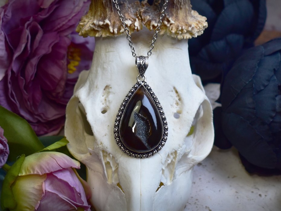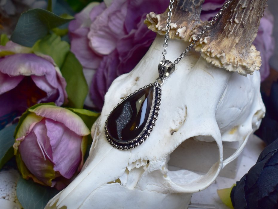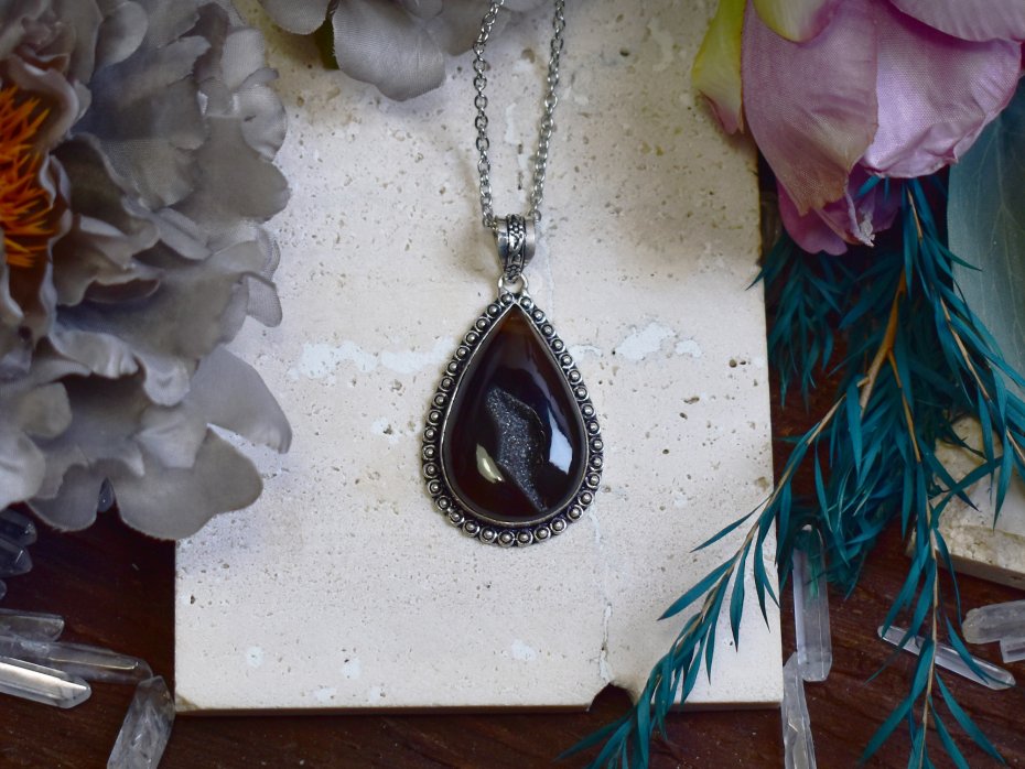 Miedziany wisiorek wykonany tradycyjnymi metodami rzemieślniczymi, ozdobiony czarnym agatem z naturalną drużą. Głęboka, ciemna barwa kamienia kontrastuje z delikatnie połyskującą strukturą kryształków, nadając biżuterii wyrazisty, a jednocześnie elegancki charakter. Naturalna druza podkreśla surowe piękno minerału i sprawia, że każdy egzemplarz jest niepowtarzalny. Prosta, stonowana oprawa pozwala skupić uwagę na kamieniu, zachowując ponadczasową formę. Czarny agat z druzą kojarzony jest z ochroną, stabilnością i ugruntowaniem, sprzyjając spokojowi i wewnętrznej równowadze. Połączenie surowej struktury kryształu z ciepłym odcieniem miedzi tworzy wisiorek o mocnym, lecz eleganckim wyrazie, idealny dla miłośników naturalnych minerałów i rękodzieła.