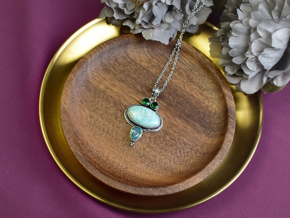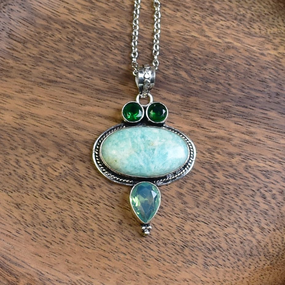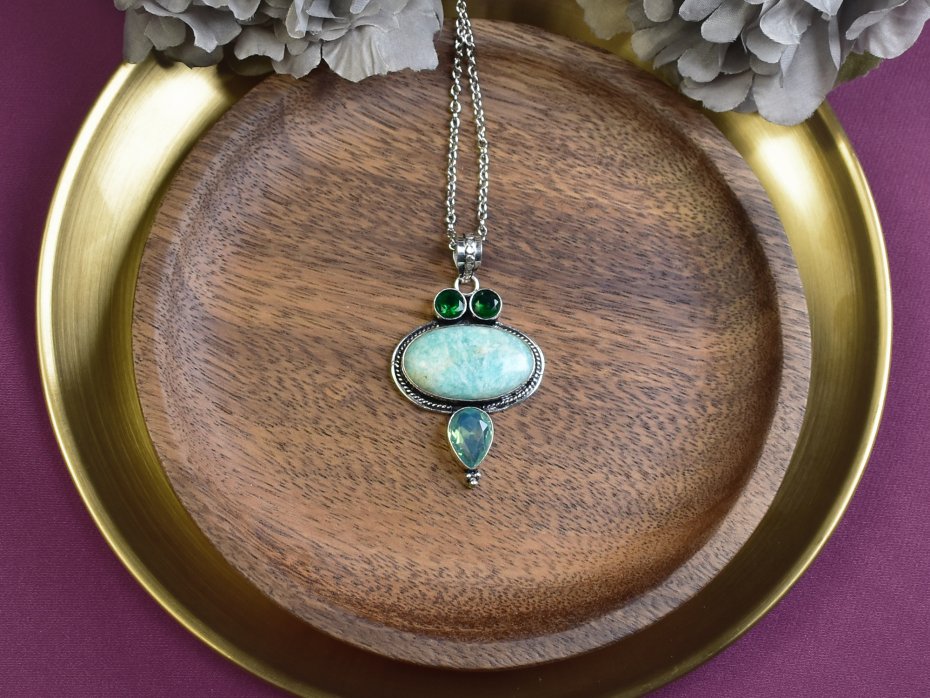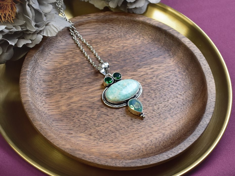 Ręcznie wykonany wisiorek z miedzi, pokryty srebrem, ozdobiony dużym amazonitem oraz mniejszymi prehnitem i zielonym kwarcem. Kamień amazonit jest znany ze swojego delikatnego odcienia niebiesko-zielonego, symbolizującego spokój i harmonię. Prehnit, z kolei, charakteryzuje się subtelnie zielonkawym lub żółto-zielonym kolorem i jest uważany za kamień ochronny, który wspomaga relaksację i równowagę emocjonalną. Zielony kwarc jest popularny ze względu na swoje właściwości oczyszczające i wzmacniające, symbolizujące wzrost duchowy i witalność. Te trzy kamienie wspólnie tworzą unikalny zestaw, który może być nie tylko piękną ozdobą, ale także źródłem pozytywnej energii i dobrej atmosfery. Wisiorek nie jest idealnie symetryczny, są to dopiero moje początki pracy ze srebrem, stąd niższa cena :)