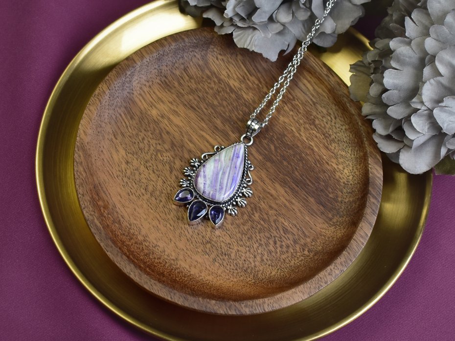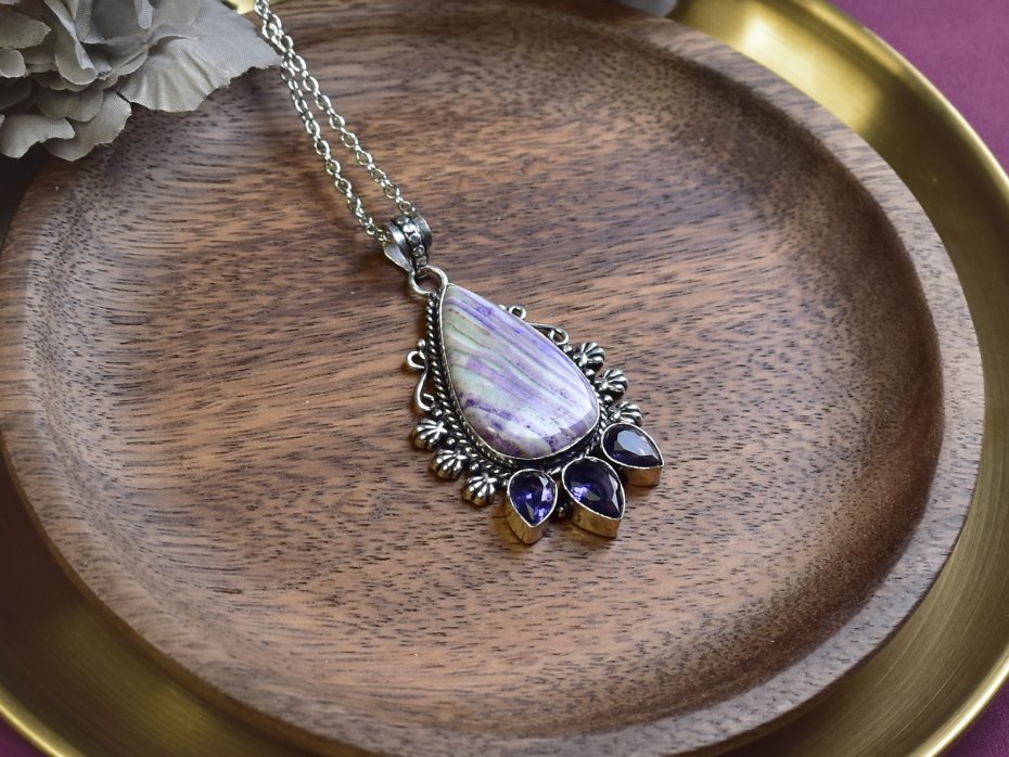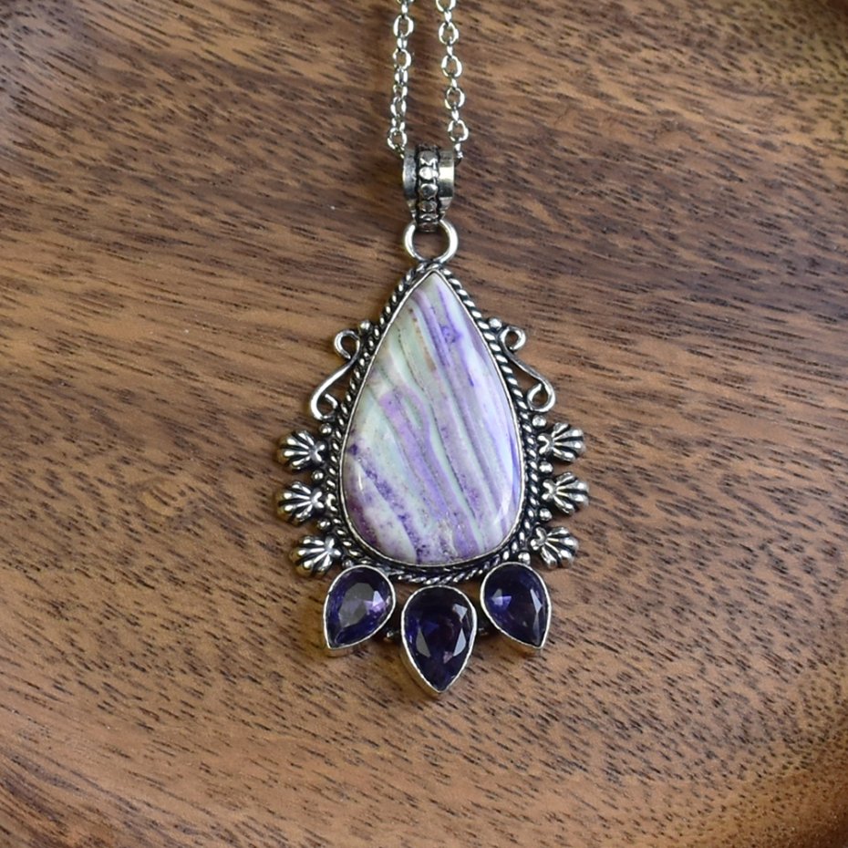 Ręcznie wykonany wisiorek z miedzi, pokryty srebrem. Zawiera jaspis w fioletowym odcieniu oraz ametysty. Jaspis jest ceniony za swoje właściwości ochronne i uspokajające. Ametyst, znany jako kamień harmonii, wspiera wewnętrzny spokój i równowagę. Idealny dodatek dla miłośników unikalnej biżuterii.