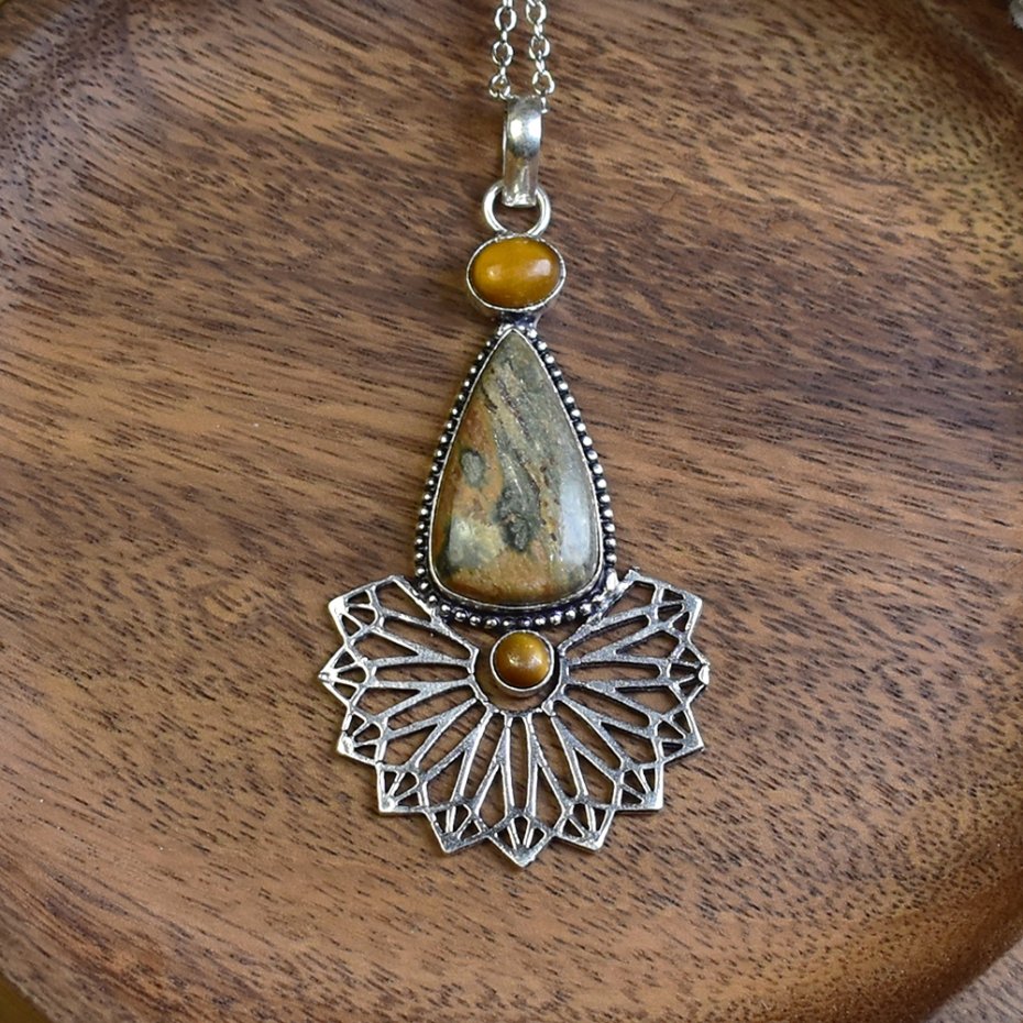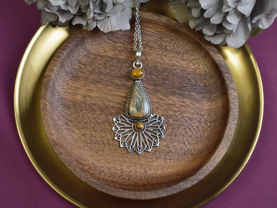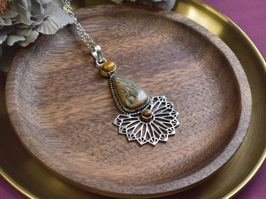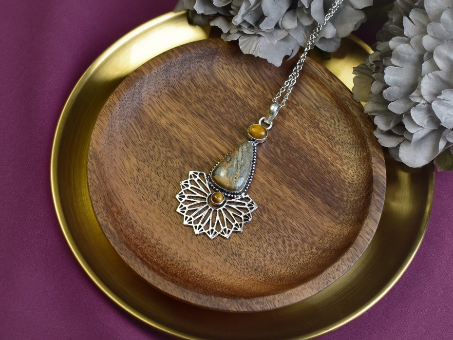 Wisiorek wykonany ręcznie z miedzi, pokryty srebrem. Ozdobiony jaspisem oraz małymi oczkami tygrysimi. Jaspis to kamień o różnych odcieniach brązu i czerwieni, znany ze swoich właściwości ochronnych i stabilizujących. Tygrysie oko natomiast jest kamieniem o pięknym, złotym połysku, kojarzonym z pewnością siebie i ochroną przed negatywnymi energiami. Wisiorek ten łączy w sobie naturalne piękno kamieni z ręcznym wykonaniem, oferując wyjątkowy dodatek do codziennego ubioru.