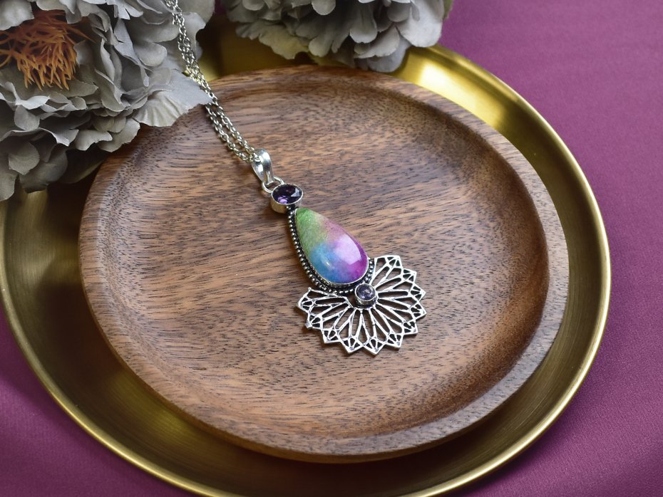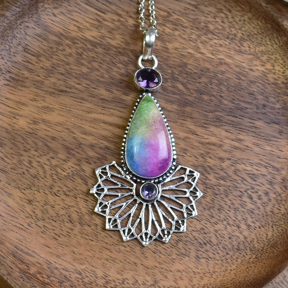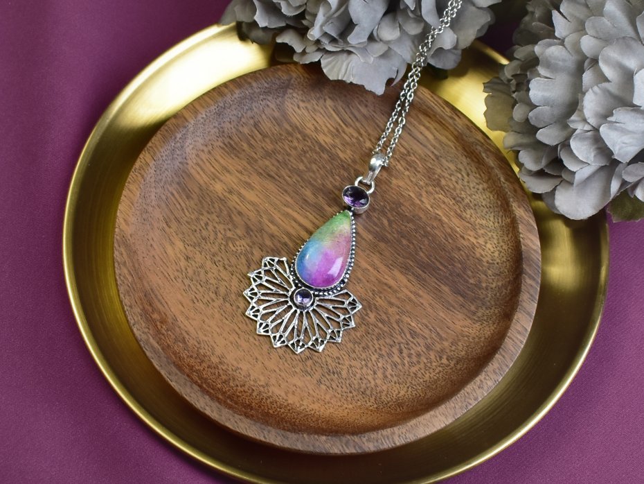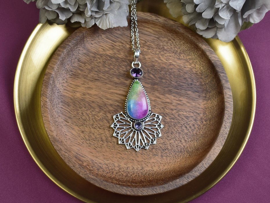 Ręcznie wykonany wisiorek z miedzi, pokryty srebrem. W centrum znajduje się tęczowy kwarc solarny, który jest znany z efektu optycznego w postaci kolorowych refleksów. Dodatkowo, wisiorek ozdobiony jest mniejszymi ametystami, cenionymi za swoje właściwości uspokajające. Kwarc solarny i ametysty tworzą harmonijną kompozycję. Produkt idealny dla osób ceniących unikatowe wyroby jubilerskie.