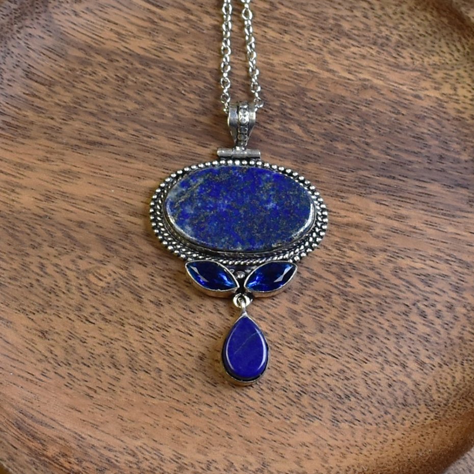 Ręcznie wykonany wisiorek z miedzi, pokryty srebrem. Głównym elementem jest duży lapis lazuli, który przyciąga uwagę swoim głębokim niebieskim kolorem. Towarzyszą mu mniejsze syntetyczne tanzanity, które dodają elegancji i blasku. Dodatkowo, wisiorek ozdobiony jest małym lapisem lazuli, który harmonizuje z większym kamieniem. Idealny dodatek do wielu stylizacji.