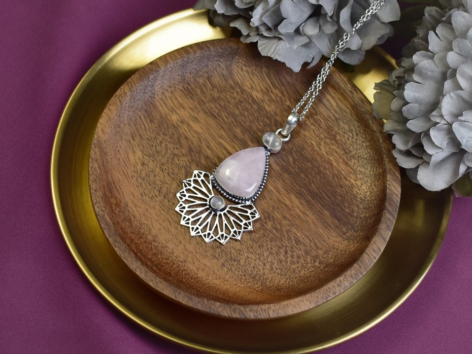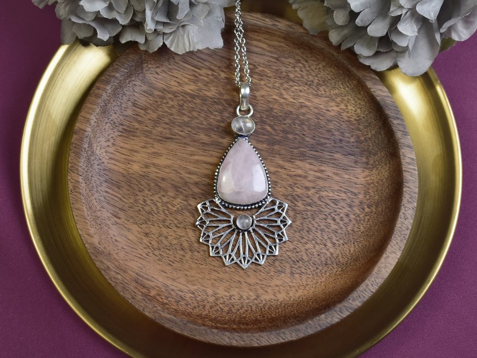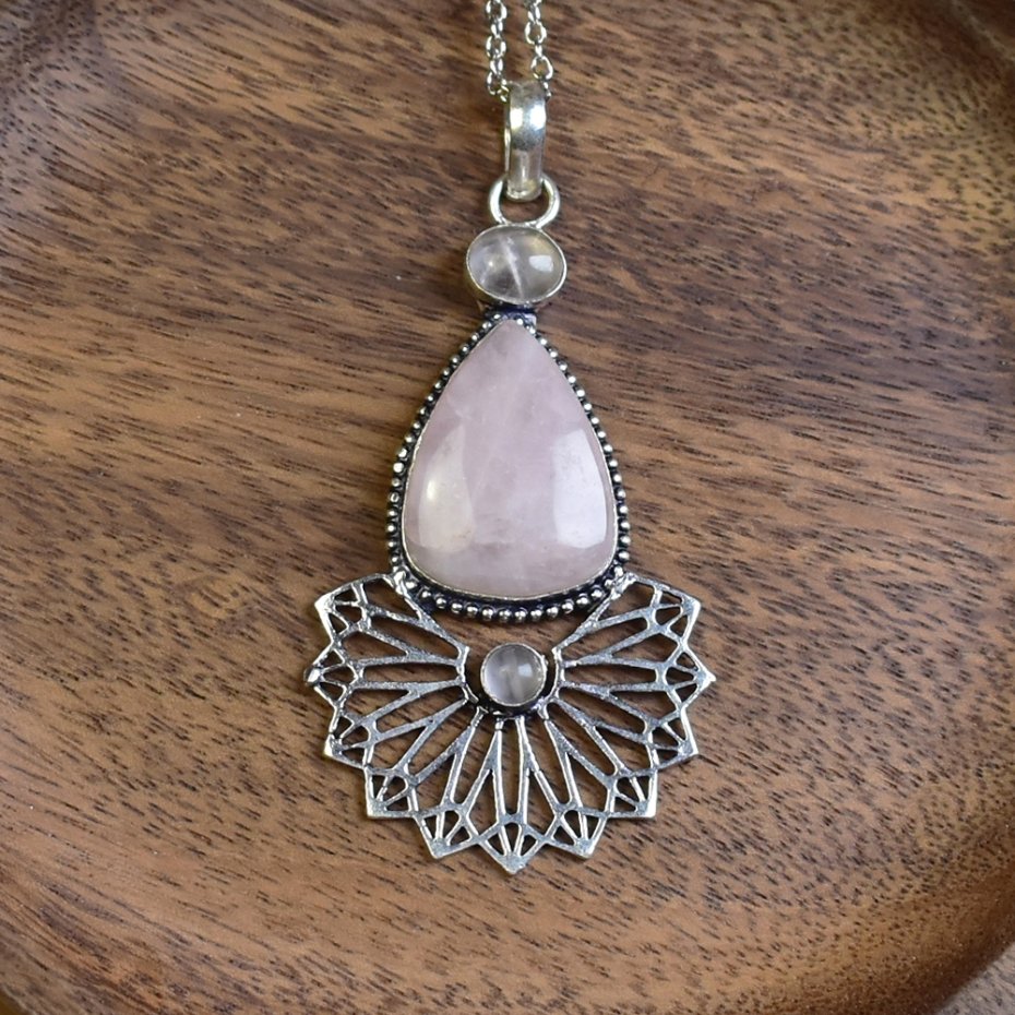 Wisiorek wykonany ręcznie z miedzi, pokryty srebrem, ozdobiony dużym różowym kwarcem oraz dwoma mniejszymi. Różowy kolor kwarcu symbolizuje miłość i harmonię, a jego naturalne wibracje mają kojący wpływ na emocje. Kamienie te znane są również z zdolności do przyciągania pozytywnej energii i promowania wewnętrznego spokoju. W połączeniu z unikalnym wykonaniem miedzi i srebra, wisiorek jest nie tylko estetycznym dodatkiem do garderoby, ale także talizmanem, który może przynieść spokój i równowagę w życiu codziennym.