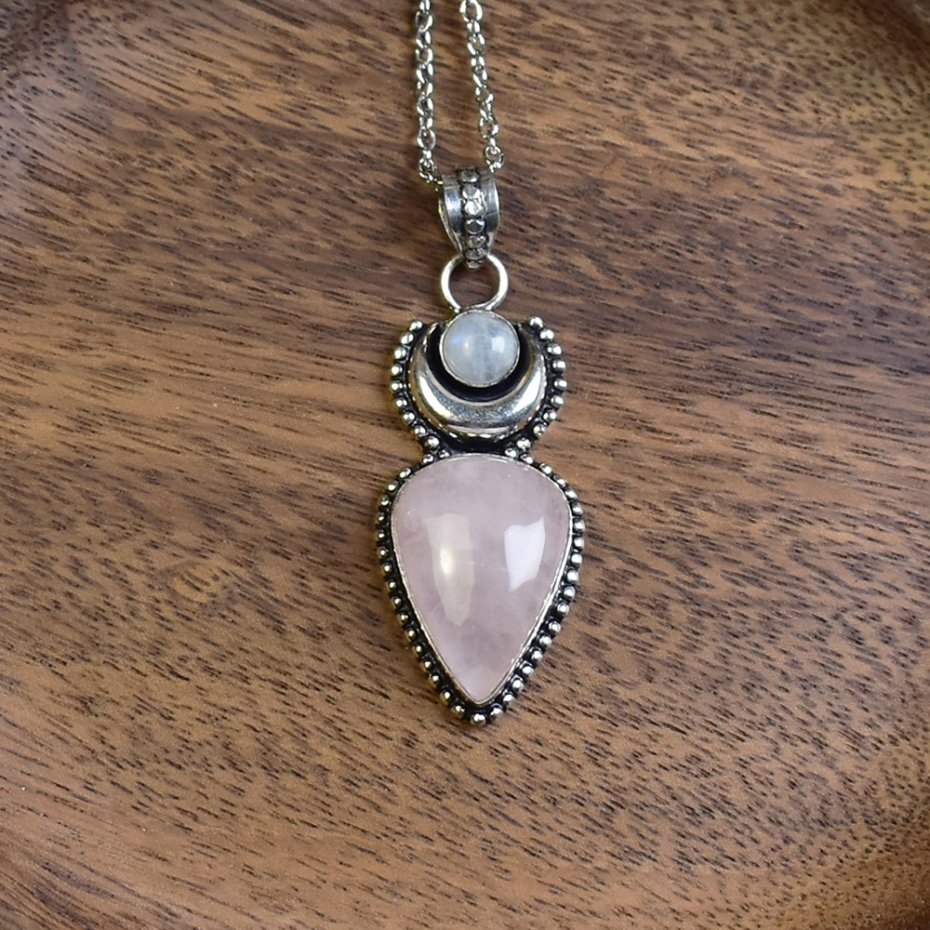 Ręcznie wykonany wisiorek z miedzi, pokryty srebrem. Wisiorek zawiera różowy kwarc i kamień księżycowy. Różowy kwarc jest znany ze swoich właściwości uspokajających i miłosnych. Kamień księżycowy kojarzony jest z intuicją i ochroną. Idealny na prezent lub jako dodatek do codziennej stylizacji.