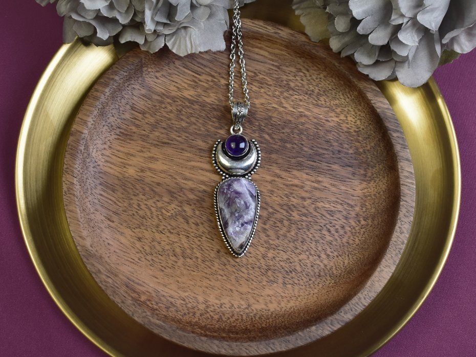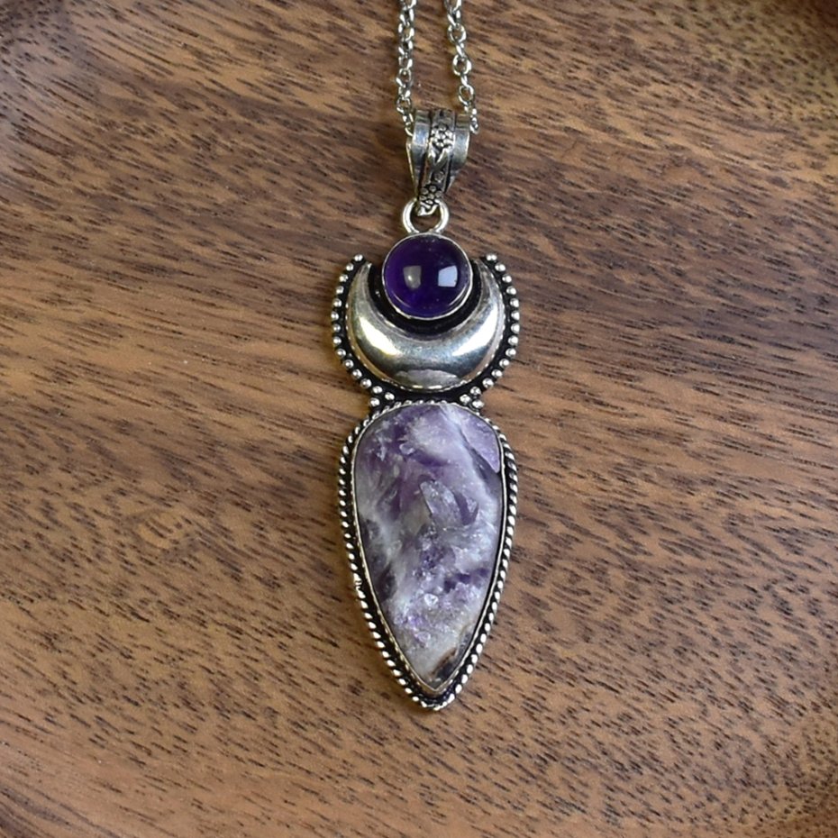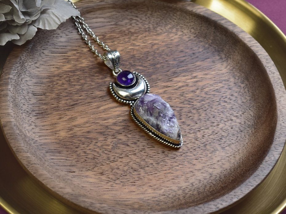 Ręcznie wykonany wisiorek z miedzi, pokryty srebrem. Głównym elementem jest surowy ametyst, uzupełniony mniejszym ametystem. Ametyst to kamień ceniony za swoje właściwości ochronne i wspomagające koncentrację. Wisiorek łączy naturalne piękno kamieni z solidnym wykonaniem. Idealny dodatek do każdej stylizacji.