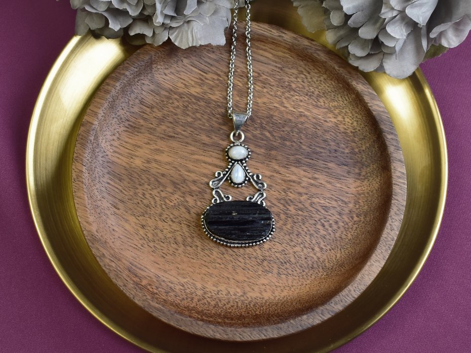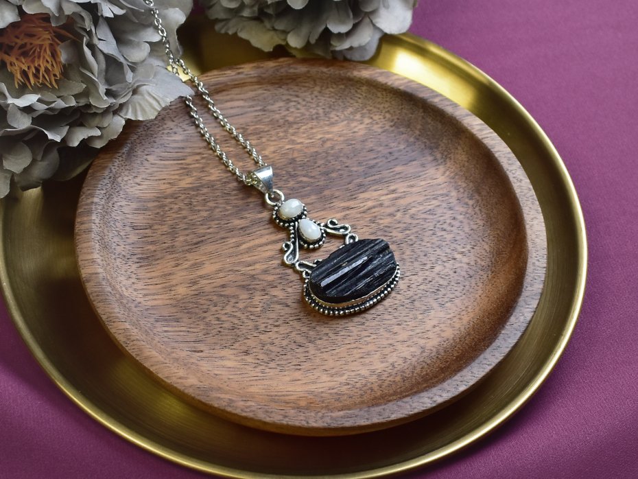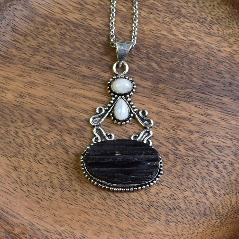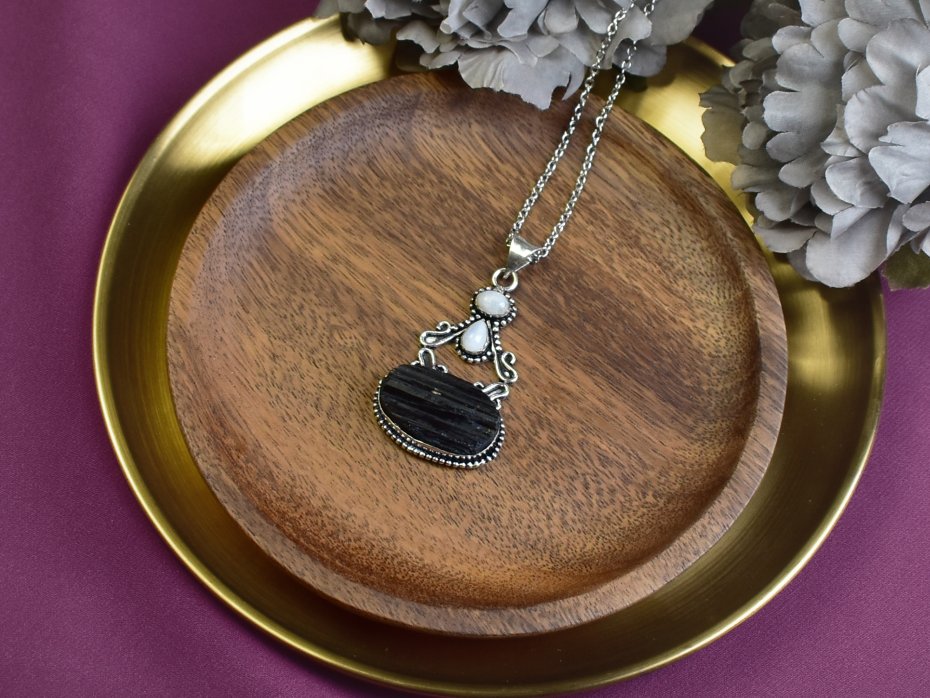 Ręcznie wykonany wisiorek z miedzi, pokryty srebrem. Główny element to surowy turmalin, otoczony mniejszymi kamieniami księżycowymi. Turmalin jest ceniony za swoje właściwości ochronne, a kamienie księżycowe są kojarzone z intuicją i wewnętrznym spokojem. Wisiorek jest unikalny dzięki naturalnemu kształtowi turmalinu. Idealny dla osób ceniących rękodzieło i naturalne kamienie.