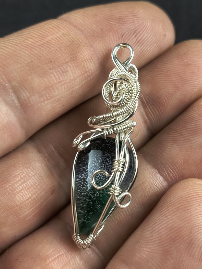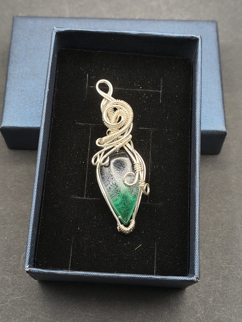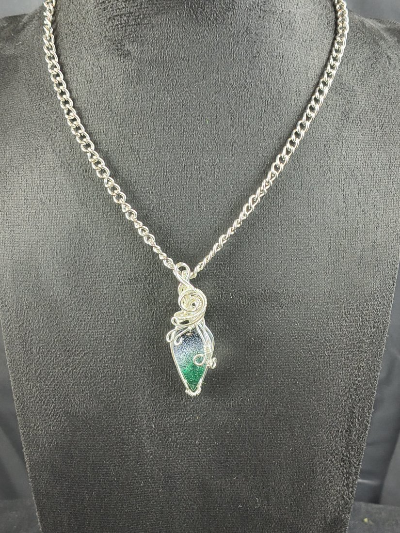 Posrebrzany wisiorek wykonany techniką wire wrapping z autorskim kamieniem z żywicy.