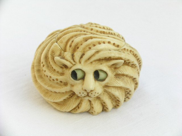 Oryginalne i wykonane z niezwykłą precyzją i uśmiechniętym polotem małe puzderko-figurka z artystycznej i kolekcjonerskiej serii miniatur Pot Belly. Koci charakter, ba! osobowość misternie w kruszonym marmurze oddane, do złudzenia przypominającym starą kość słoniową. Na drobne mementa, skarby, coś wyjątkowego... Ku radości, do kolekcji i na prezent :) 5,5 x 5,5 x 6,5 cm. Stan zachowania bardzo dobry.