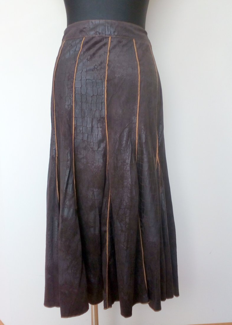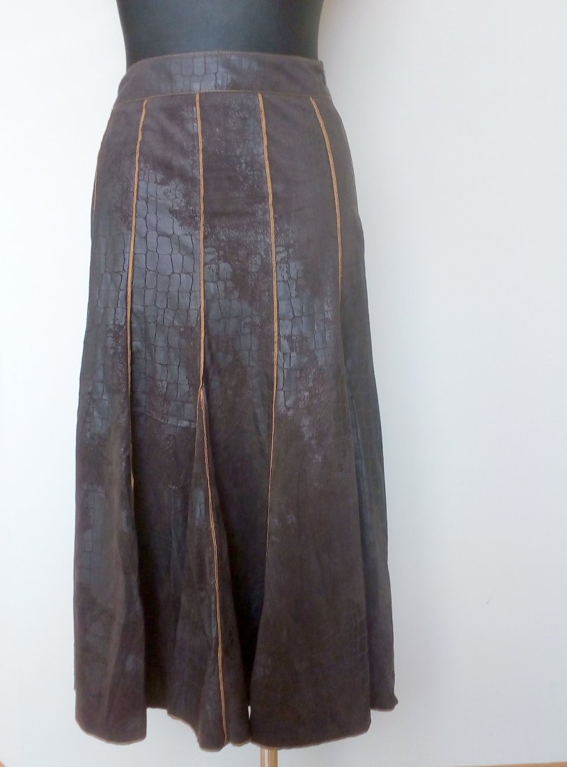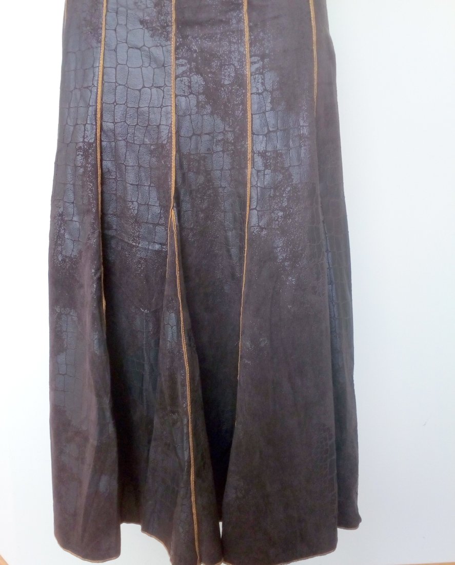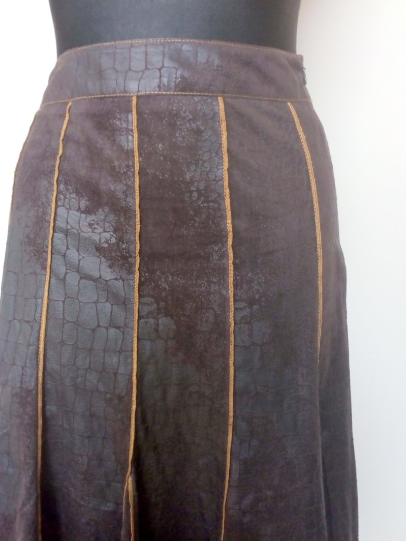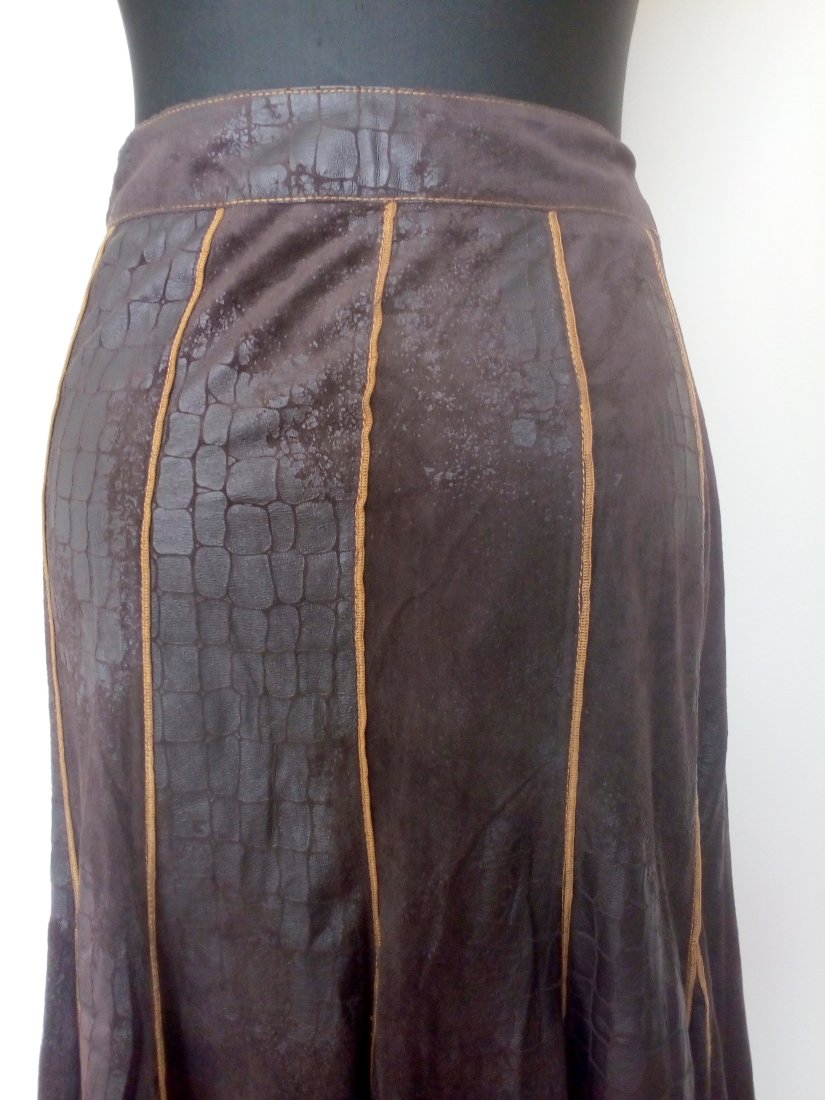 ładna, długa spódnica z miękkiej tkaniny imitującej zamsz, uszyta z klinów stębnowanych rudą nitka, rozszerzana dołem godetami, zapinana z boku na zamek, całość bez podszewki