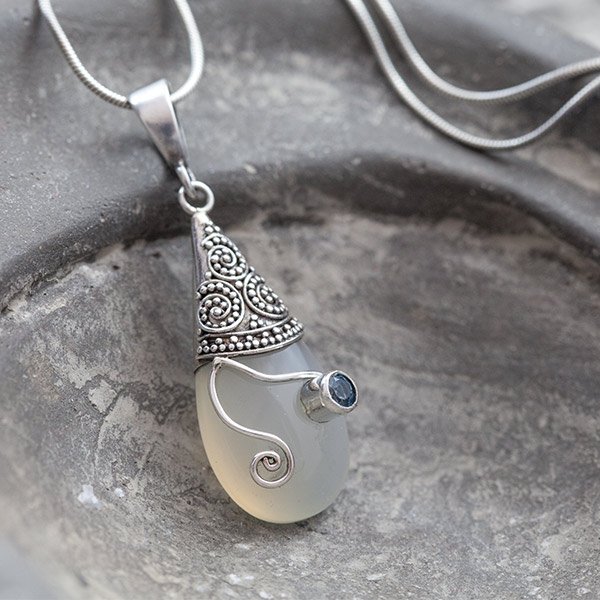 Kamień księżycowy ubrany w pięknie zdobione srebro próby 925 i ozdobiony błękitnym topazem. Wielkość wisiorka 28x12 mm. Długość całkowita wisiorka 4 cm. Wisiorek zawiesiłam na srebrnym łańcuszku typu żmijka. Długość łańcuszka 46 cm. Naszyjnik jest ozdobnie zapakowany.