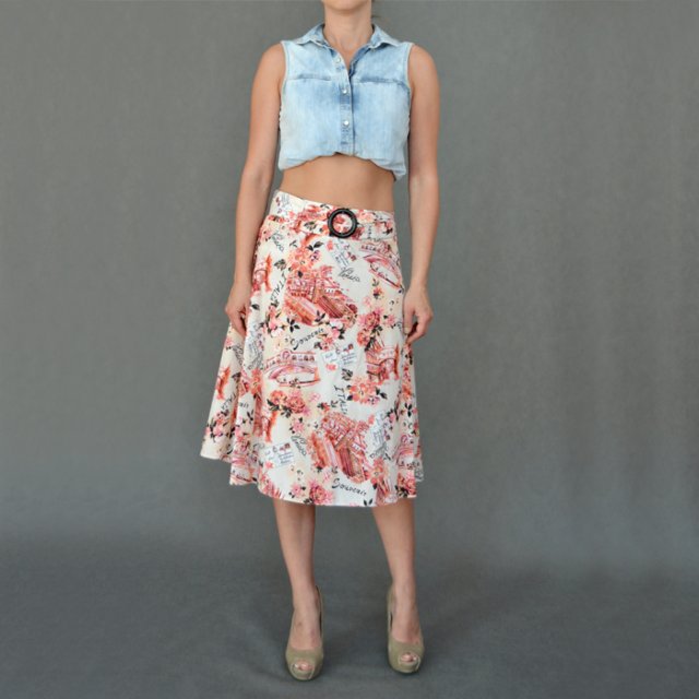 Spódniczka z widokówkami i widokami Italii. Z paskiem z klamerką. Krój litery A.