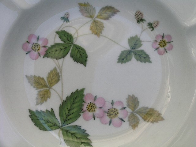 Porcelanowa popielniczka z kolekcjonerskiej serii Wild Strawberry, sygnowana jakością Wedgwooda. Kremowa biel porcelany i delikatne, błyszcące szkliwienie, złocony rant. 11,5 x 2 cm. Stan zachowania bardzo dobry.