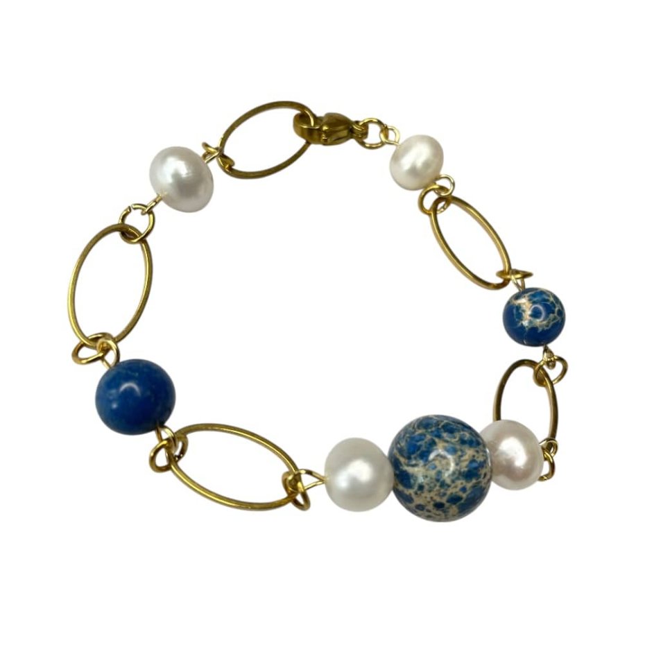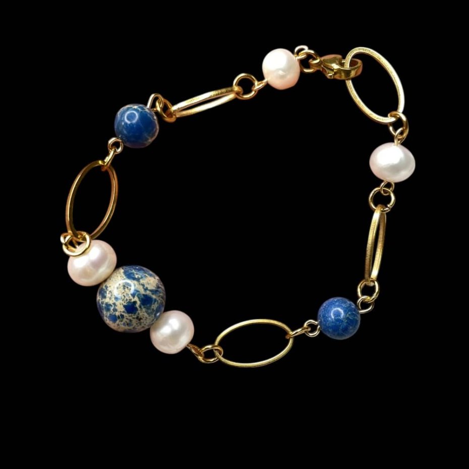 Złocona bransoletka z perłami i jaspisem łączy w sobie ponadczasową elegancję z nowoczesną lekkością formy. Smukłe, owalne ogniwa nadają jej subtelnego rytmu, a zestawienie pereł z jaspisem buduje harmonijną grę kolorów i faktur. Złocone detale delikatnie wydobywają naturalny połysk kamieni, podkreślając szlachetny charakter całości. To biżuteria prosta, a jednocześnie dopracowana w każdym detalu — idealna dla osób, które cenią klasykę w świeżym, współczesnym wydaniu.