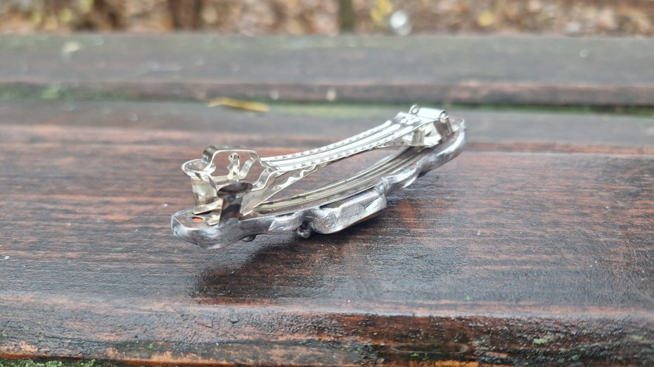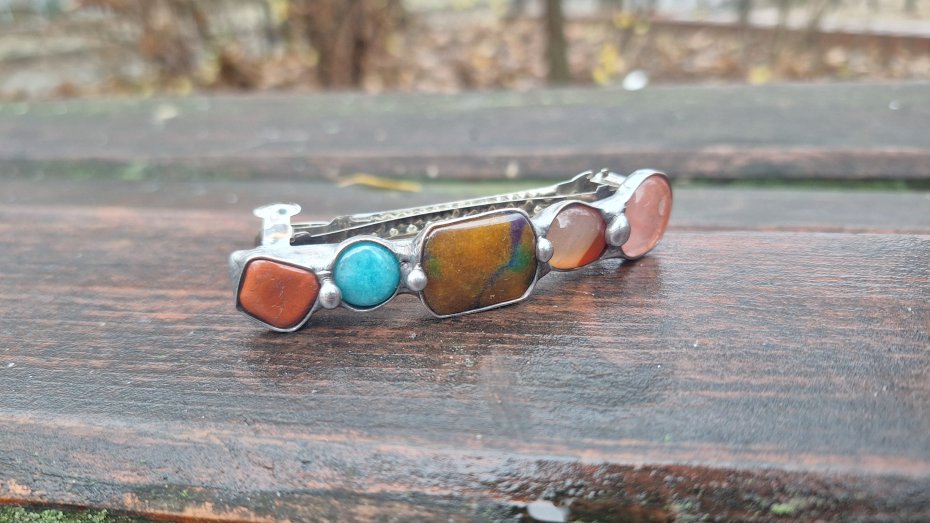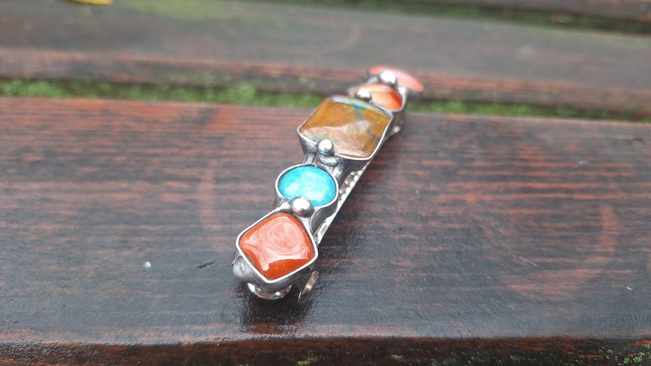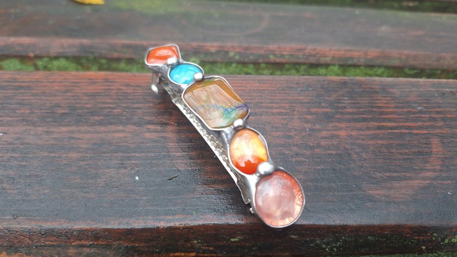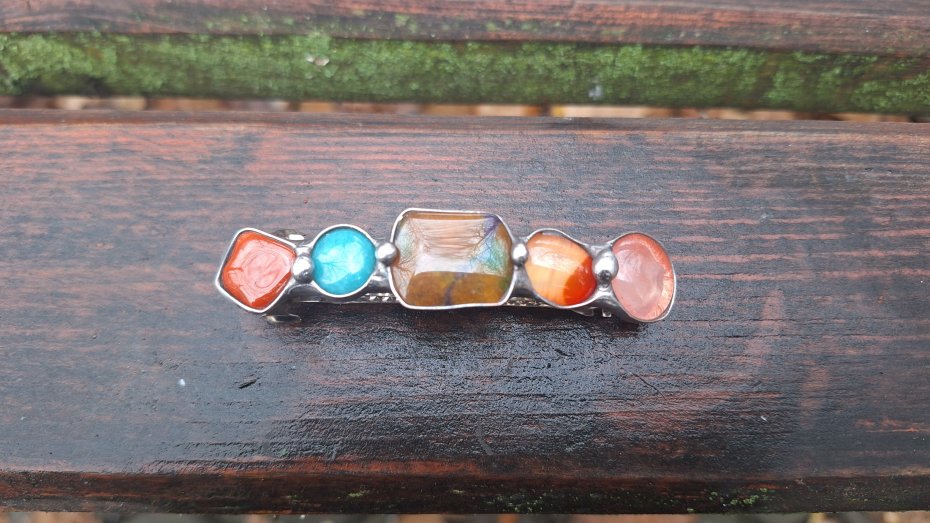 Klamra do włosów, wykonana z miedzi, cyny, agatu, jadeitu, jaspisu i kwarcu. Wymiary ok. 8 na 1.5 cm. Zapięcie 6 cm, metalowe.