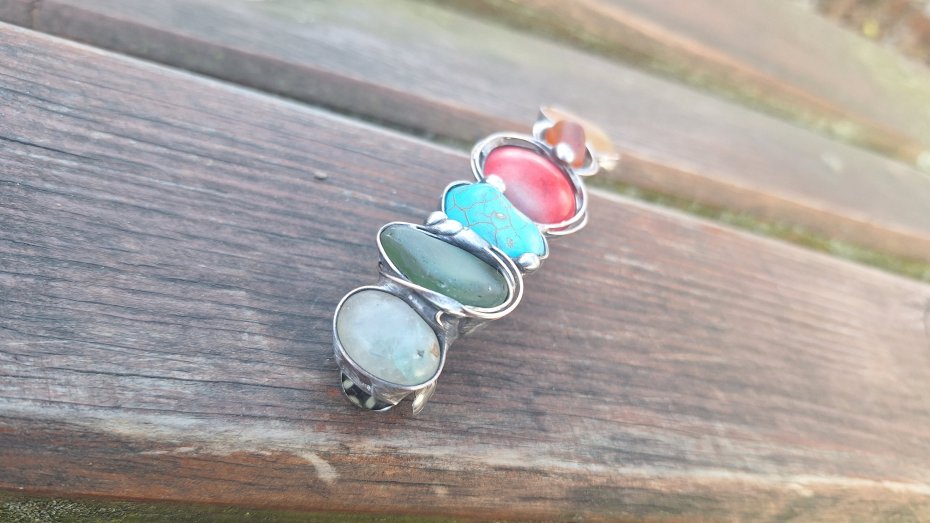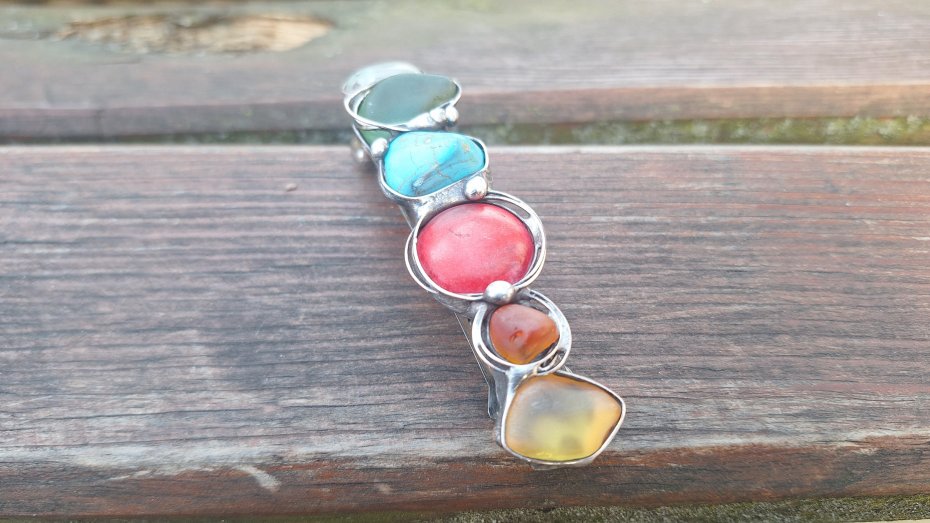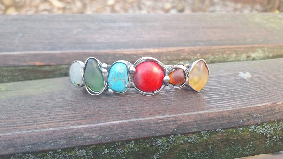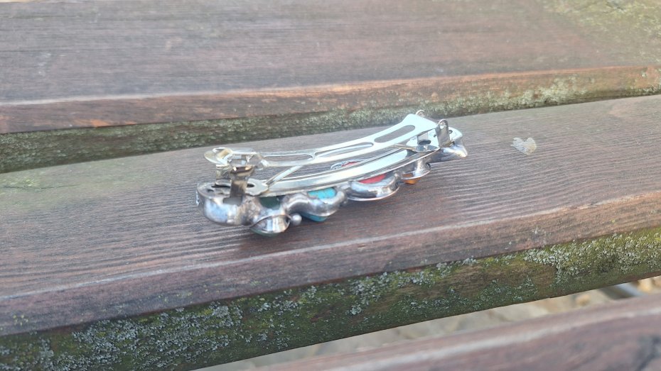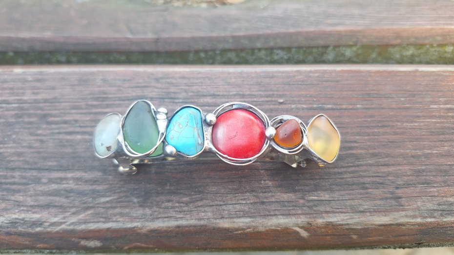 Klamra do włosów, wykonana z miedzi, cyny, howlitów, chryzoprazu i szkła. Wymiary ok. 8 na 2 cm. Zapięcie 6 cm, metalowe.