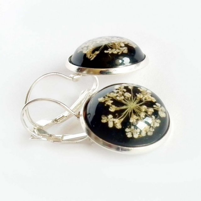 Efektowne, eleganckie krótkie kolczyki z prawdziwymi suszonymi kwiatami zatopionymi w żywicy w oprawie w kolorze srebra.
