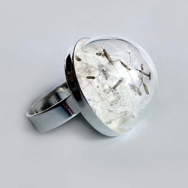 Unikatowy, piękny pierścionek z prawdziwymi nasionkami dmuchawca umieszczonymi pod wypukłym szkłem, w oprawie w kolorze srebrnym. Pierścionek jest lekki, bańka wewnątrz pusta i delikatna, należy w związku z tym unikać zderzenia pierścionka z twardymi powierzchniami. Wymiar oczka: średnica 2,8 cm. Rozmiar: uniwersalny/regulowany.
