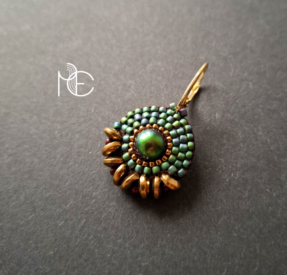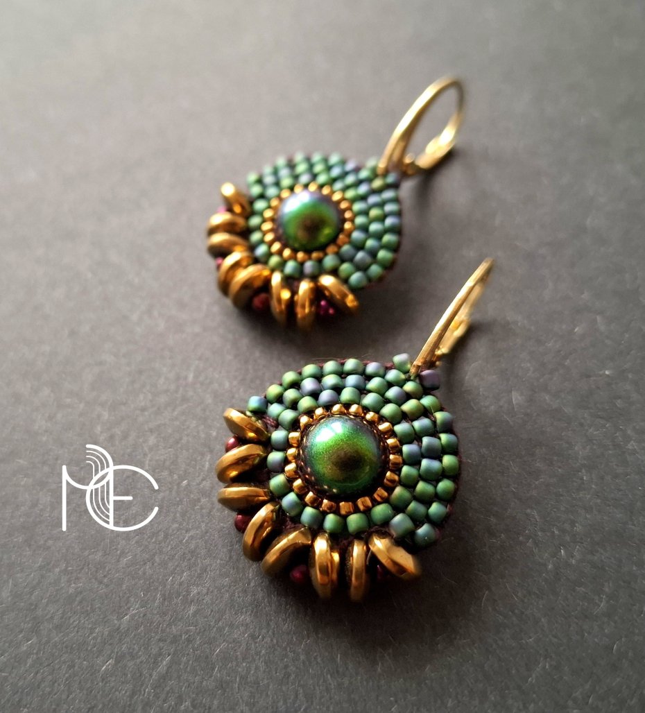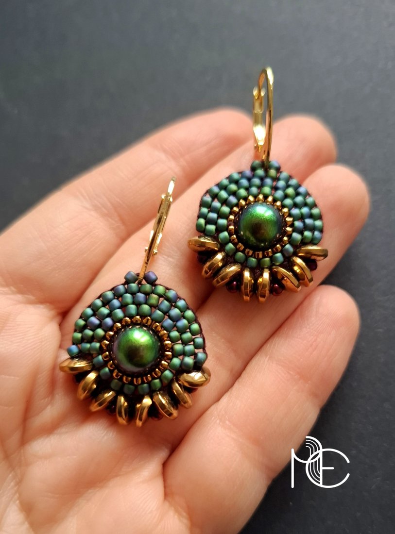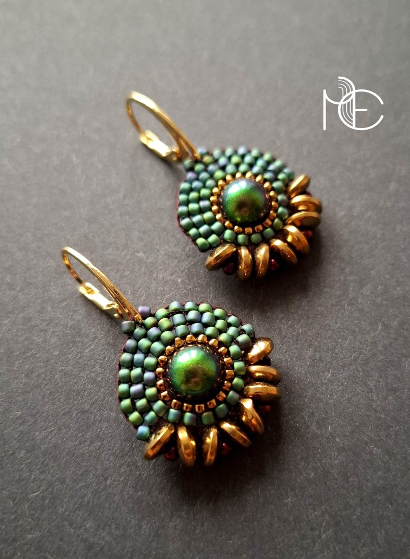 Kolczyki wiszące wykonane techniką swoistego haftu drobnymi, szklanymi koralikami w połączeniu z perłami swarovskiego oraz hematytami platerowanymi. Dwustronne, podwieszone na pozłacanych i nieuczulających biglach typu angielskiego. Wymiary: długość wraz z zapięciem: 4 cm, szerokość max. 2,8 cm.