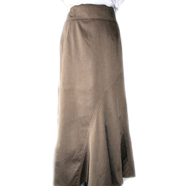 Spódnica uszyta z połyskującej tkaniny w delikatny prążek na karczku wys. 6cm. Wymiary: pas 76 cm, biodra 96cm, długość 84 cm. Spódnica na podszewce. Z boku kryty zamek.spódnica bardzo efektowna dzięki ukośnym cięciom od biodra do dołu i wstawionym godetom dającym efekt rozkloszowania i asymetrii.