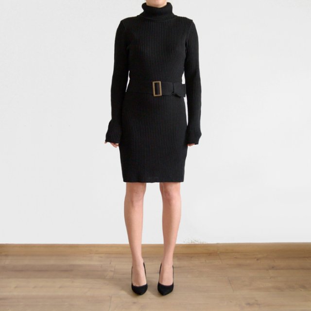 Czarna sukienka z golfem o prążkowanej fakturze. Z paskiem ale można nosić też bez, bo nie ma szlufek.