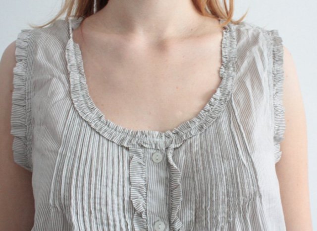 Prążkowana bluzka zapinana na guziczki. Ponadczasowa klasyka, która idealnie będzie wyglądać pod żakietem lub w wersji casualowej na lato. Materiał to w mojej ocenie bawełna.