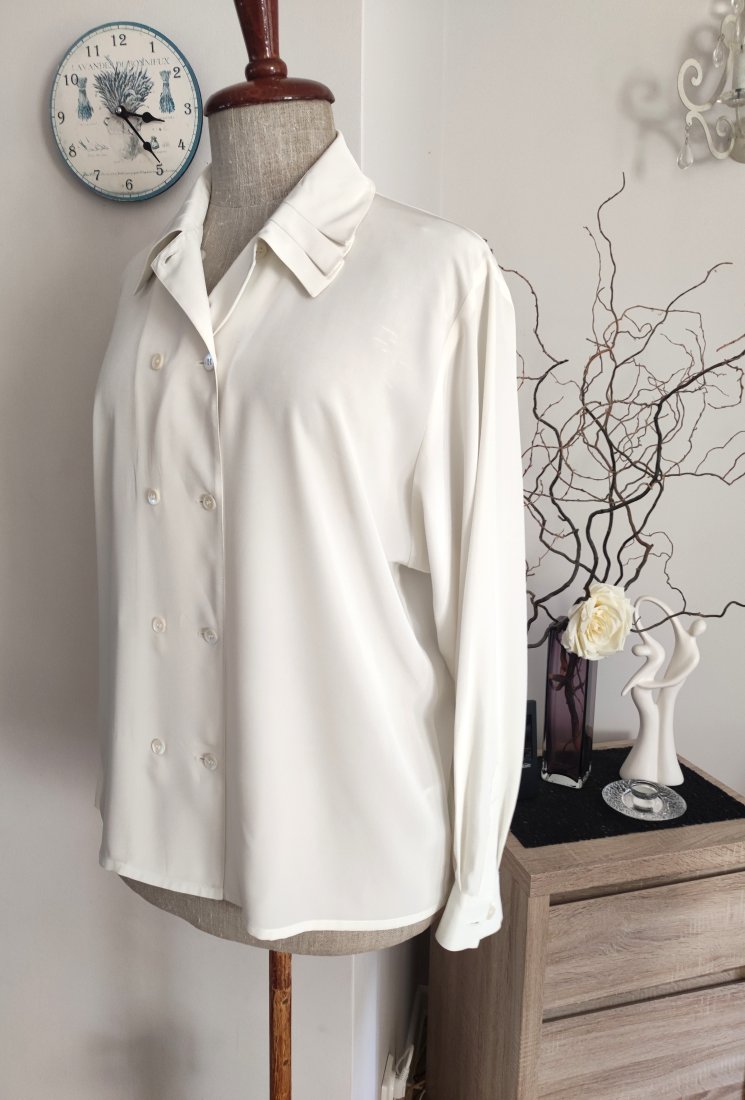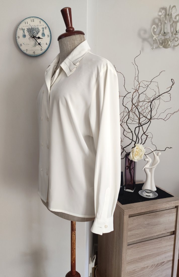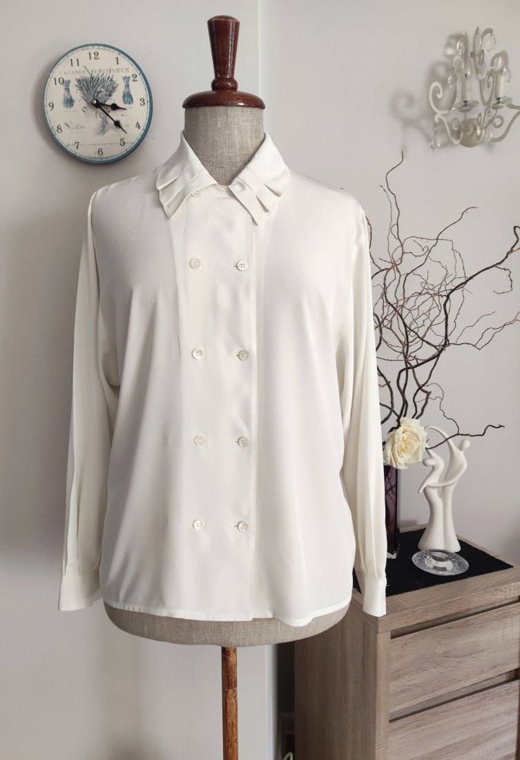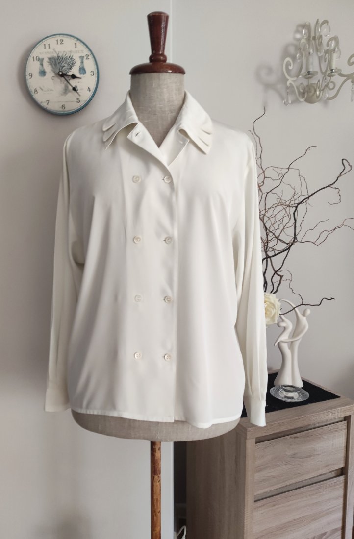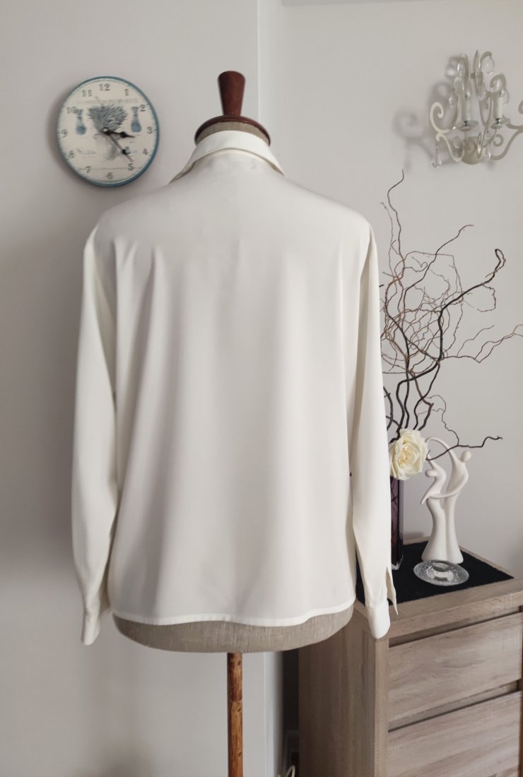 Elegancka bluzka wyjściowa z efektownym kołnierzem,ze śliskiego chłodzącego materiału,w kolorze ecru. Nowa bez metki.