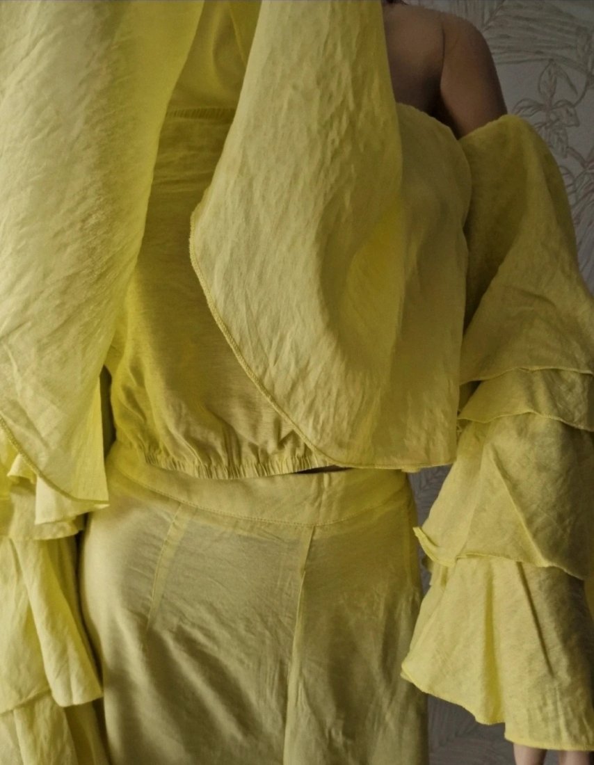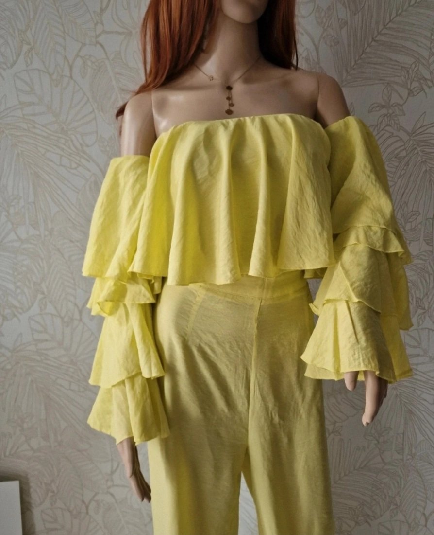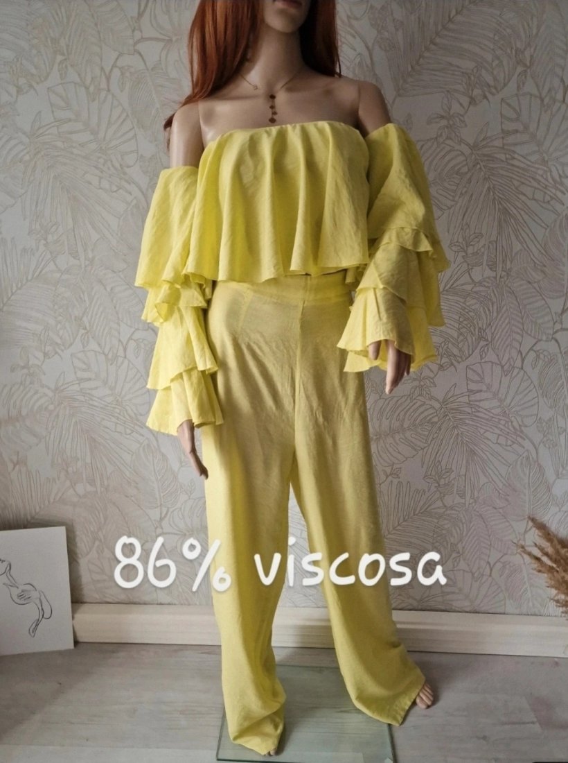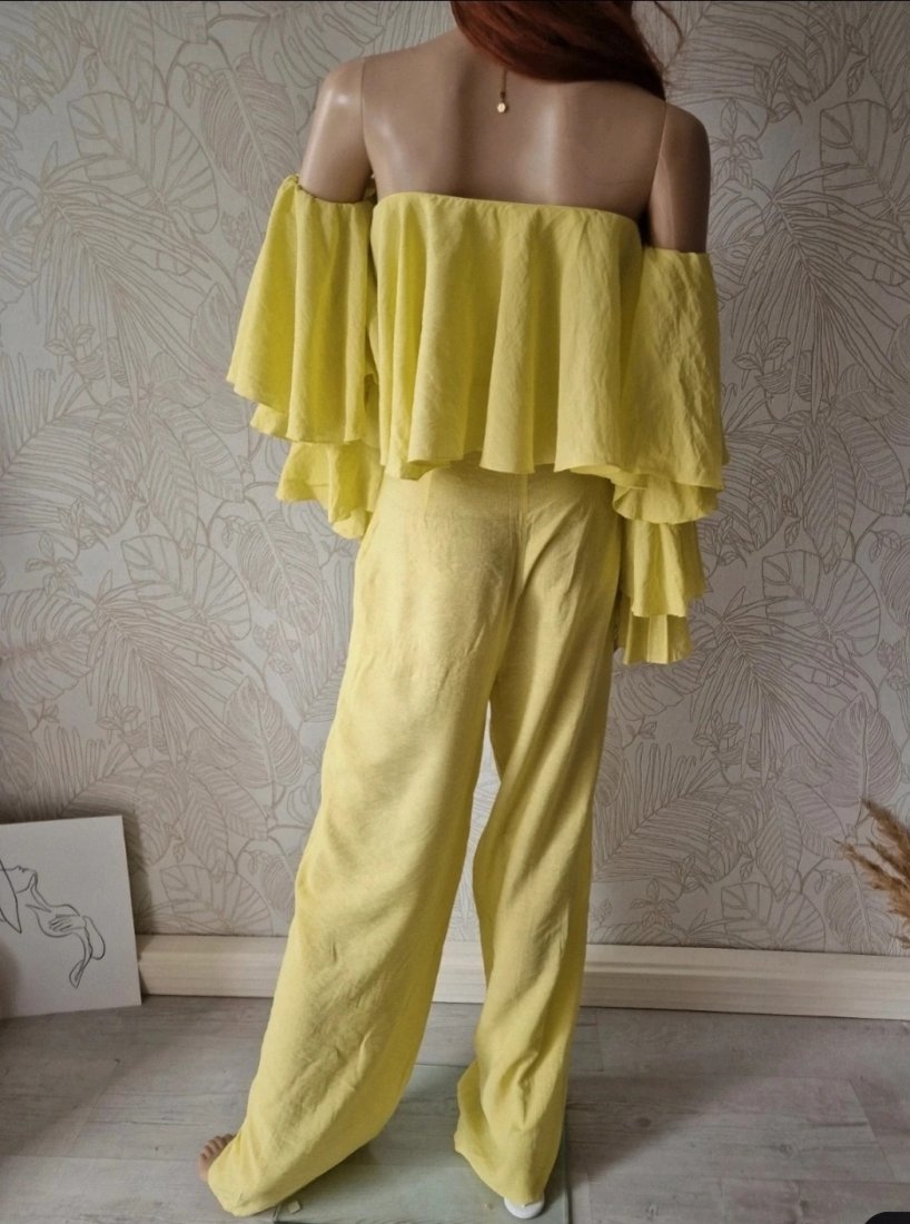 Spodnie z szeroką nogawką, wysoki stan. Falbaniaste rękawy, hiszpanka.