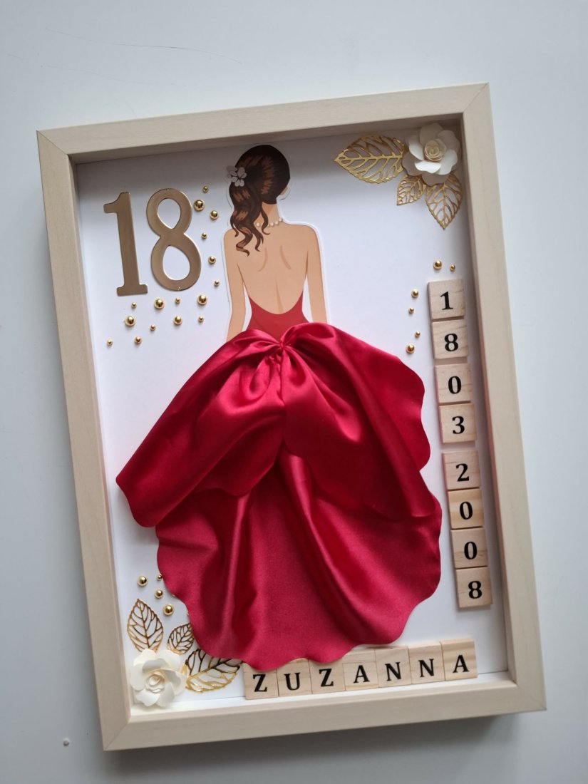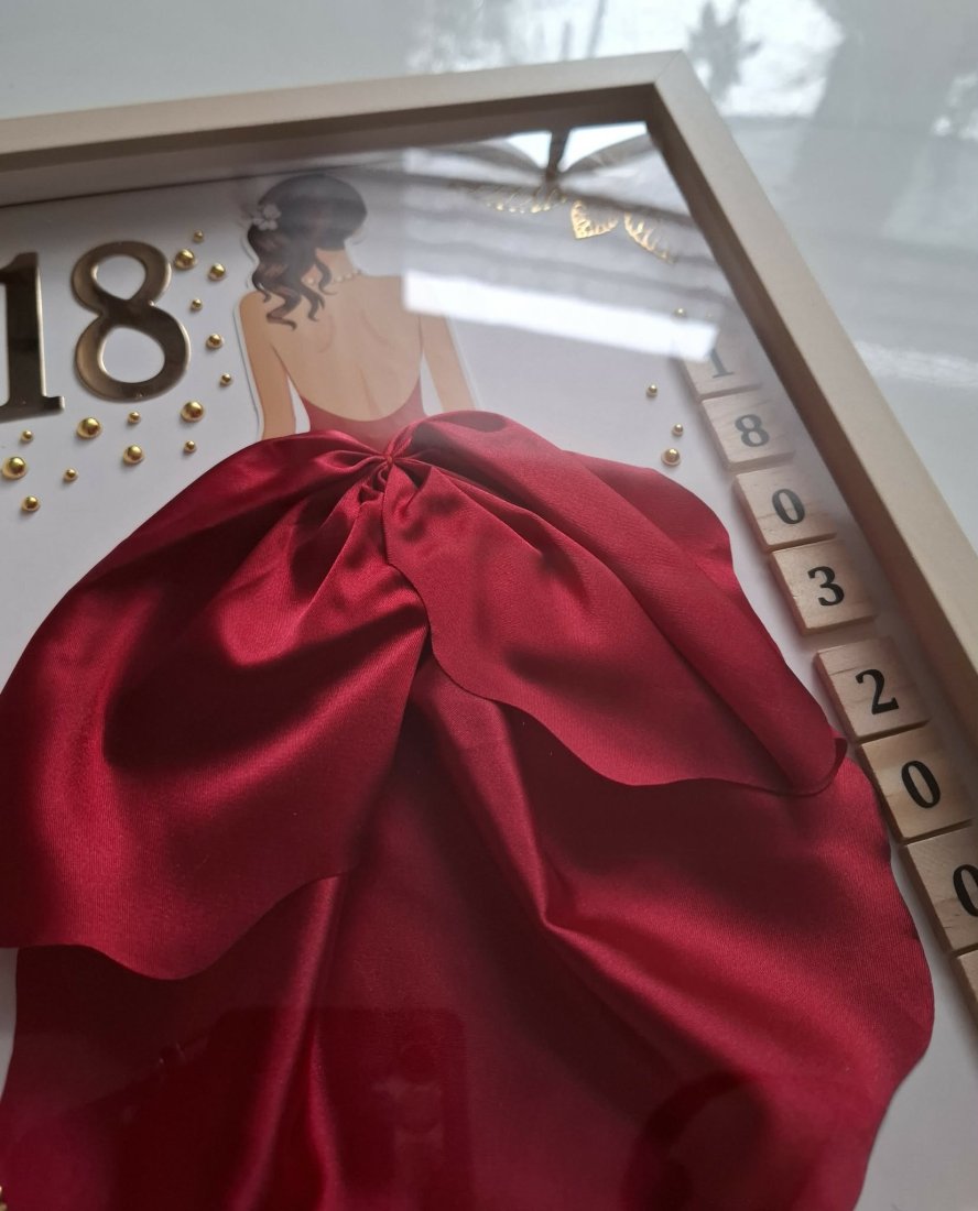 Efektowna sukienka 3D wykonana z satynowego materiału, złote detale oraz możliwość personalizacji sprawiają, że jest to idealny prezent "na wejście w dorosłość".