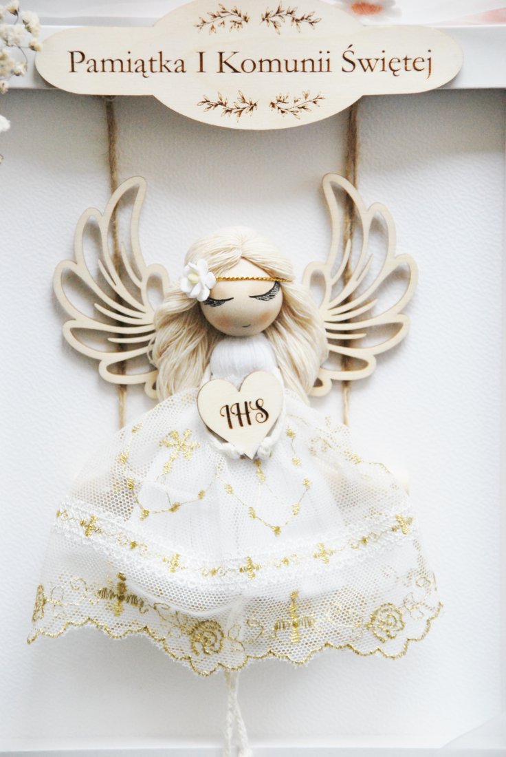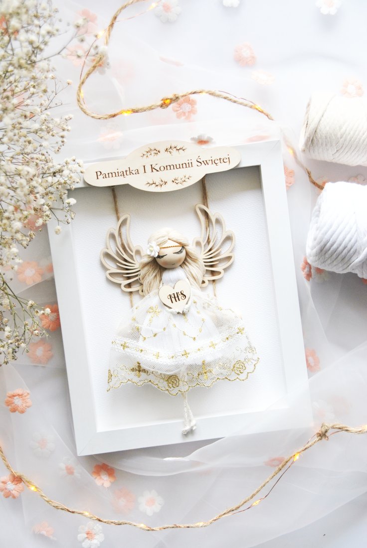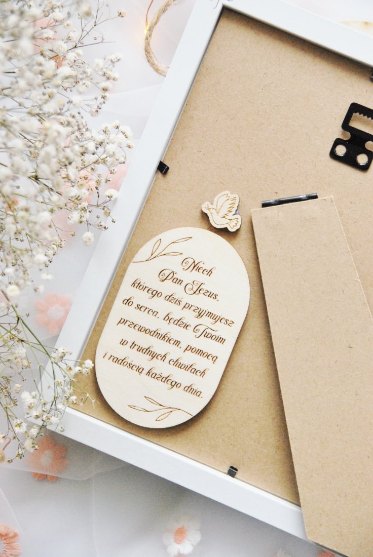 Całość zamknięta jest w estetycznej, jasnej ramce z napisem Pamiątka I Komunii Świętej. To upominek, który z dumą można postawić na półce lub powiesić w dziecięcym pokoju, gdzie każdego dnia będzie przypominał o wartościach, wierze i miłości najbliższych.