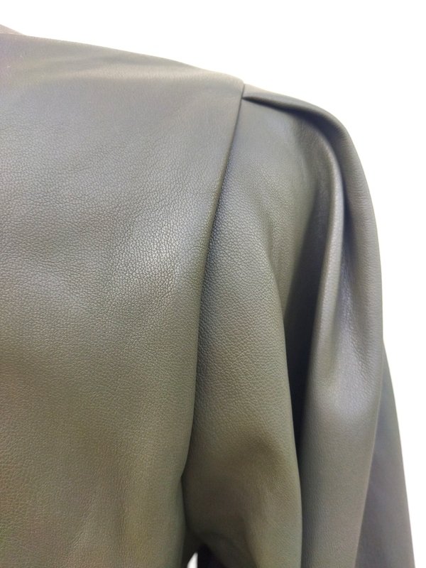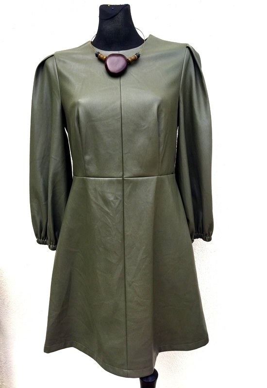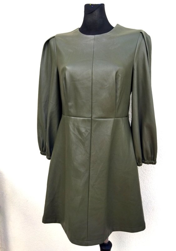 Sukienka z dobrej jakości miękkiej skóry ekologicznej w kolorze ciemnej oliwkowej zieleni, od wewnątrz miła powłoka. Odcinana w pasie, z bufiastymi rękawami zebranymi u dołu gumką, dół trapezowy . Zapinana z tyłu na zamek. -