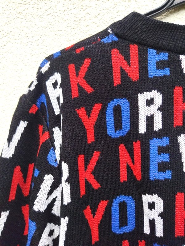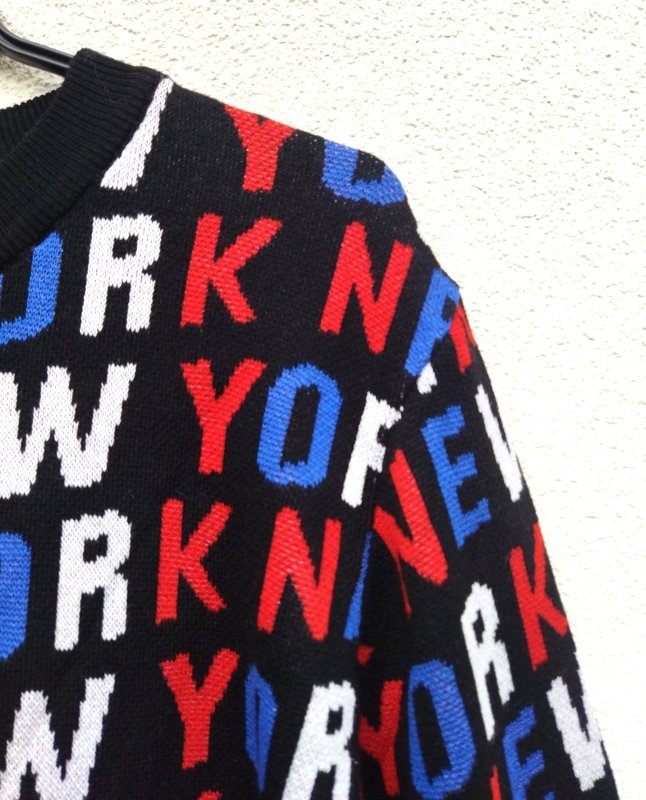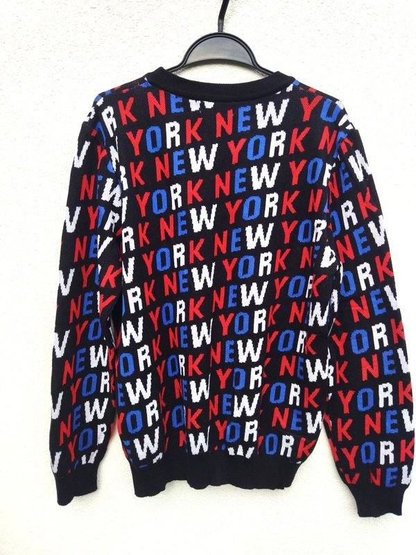 Wzorzysty sweter z bawełny i akrylu z kolorowymi napisami na czarnym tle. Prosty luźny fason z owalny dekoltem . Wykończony ściągaczami.
