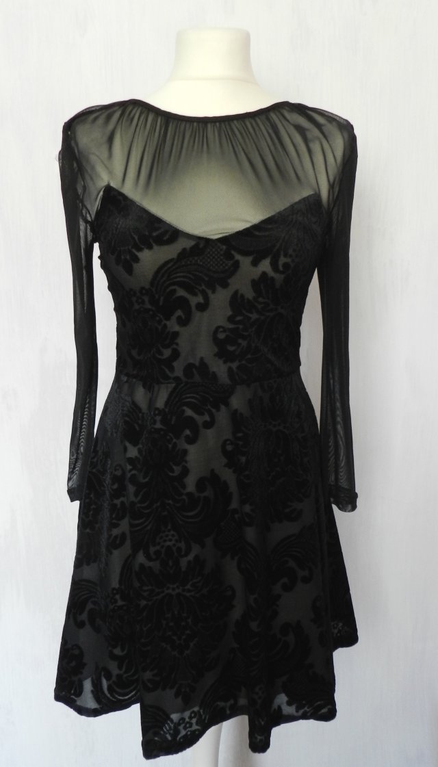 Czarna sukienka w ciekawej czarnej kolorystyce - rękawy, dekolt i plecy wykończone cienką czarną sieteczką - z tyłu wycięcie w kształcie łezki.
