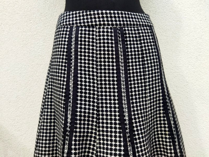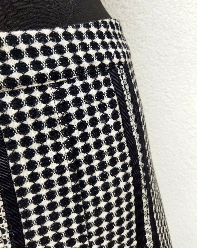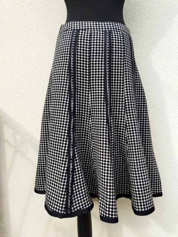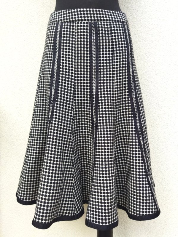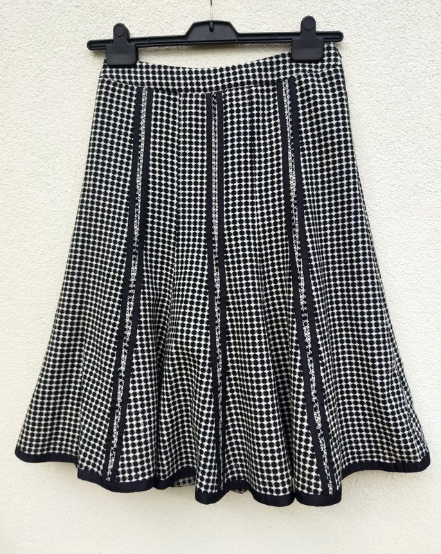 Ładna dobrej jakości spódnica z wzorzystej tkaniny w czarno - białej kolorystyce, zdobiona czarnymi rypsowymi taśmami. Szyta z klinów dopasowana w biodrach rozkloszowana dołem ładnie się układa na figurze. zapinana z boku na zamek.. Na podszewce.