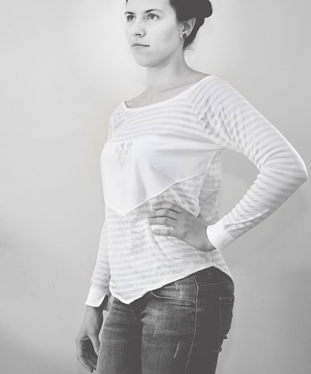 Bluzeczka wykonana została z białej cienkiej, lekko połyskującej elastycznej dzianiny w prążki oraz gładkiej grubszej dzianiny. Z przodu ozdobne guziczki uformowane w trójkąt. Rozmiar S