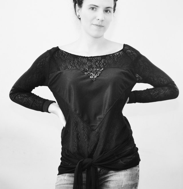 Bluzeczka/Tunika wykonana została z czarnej cienkiej, lekko elastycznej koronki, dzianiny oraz miękkiego tiulu. Z przodu ozdobne guziczki uformowane w trójkąt, tiul lekko opadający w dół, można przewiązać tak jak na zdjęciu. Rozmiar M