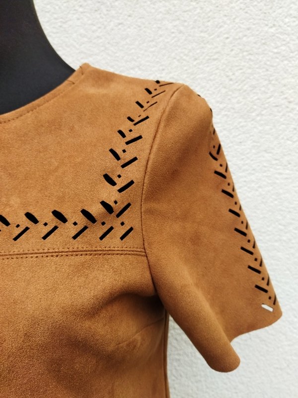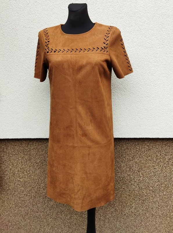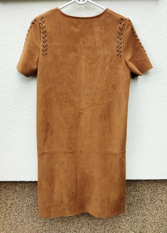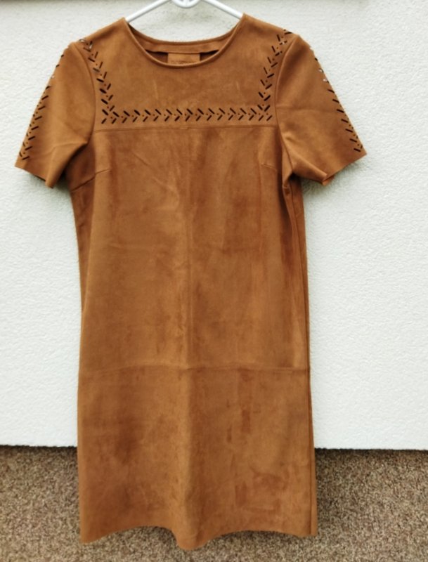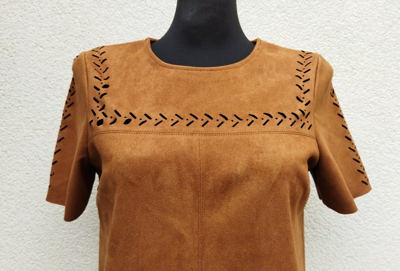 Sukienka z tkaniny imitującej zamszową skórę naturalną w koniakowym kolorze . Minimalistyczny prosty krój z ażurowymi laserowymi wycięciami. Wciągana bez zamka.Bez podszewki