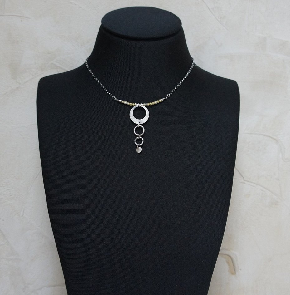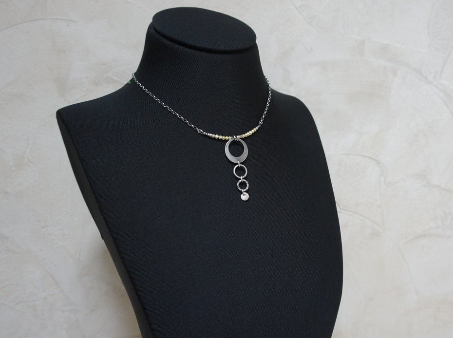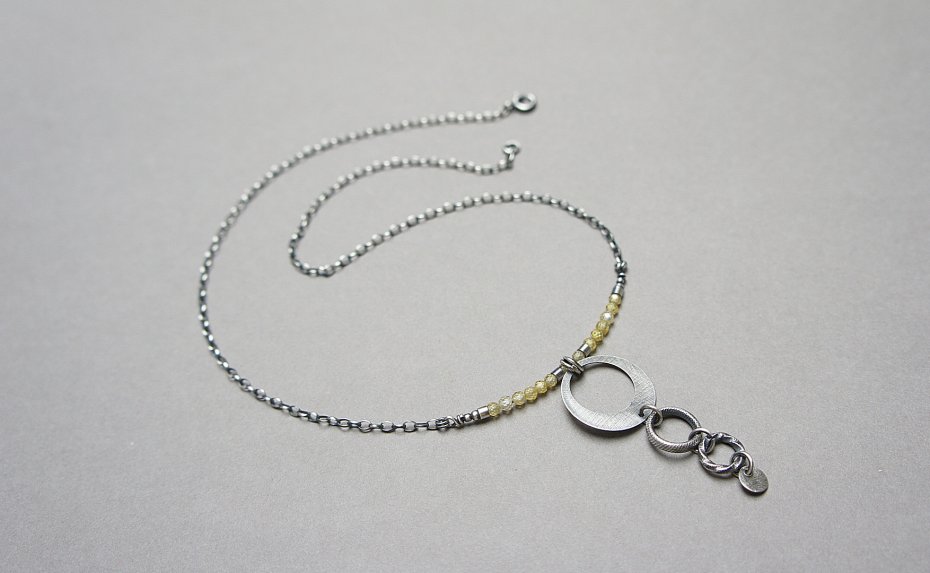 Naszyjnik wykonany ze srebra [pr. 925 ] w połączeniu cyrkoniami [3mm] oraz srebrnymi kołami [20mm ,12mm ,10mm i 6mm]. Długość naszyjnika około 45cm. Srebro oksydowane i przetarte. Biżuteria ozdobnie zapakowana
