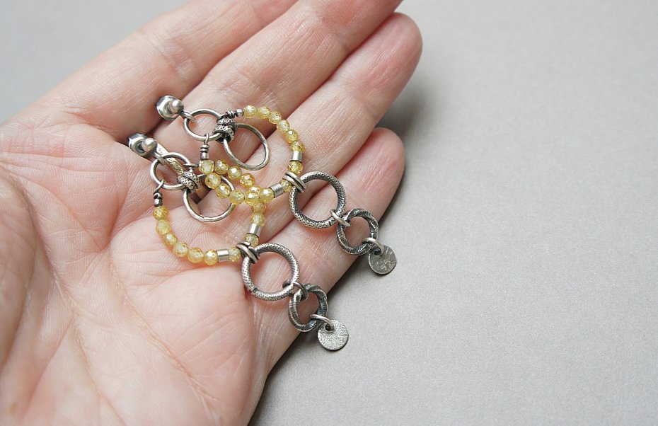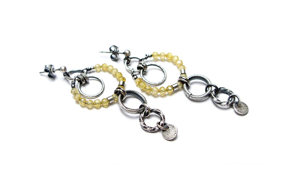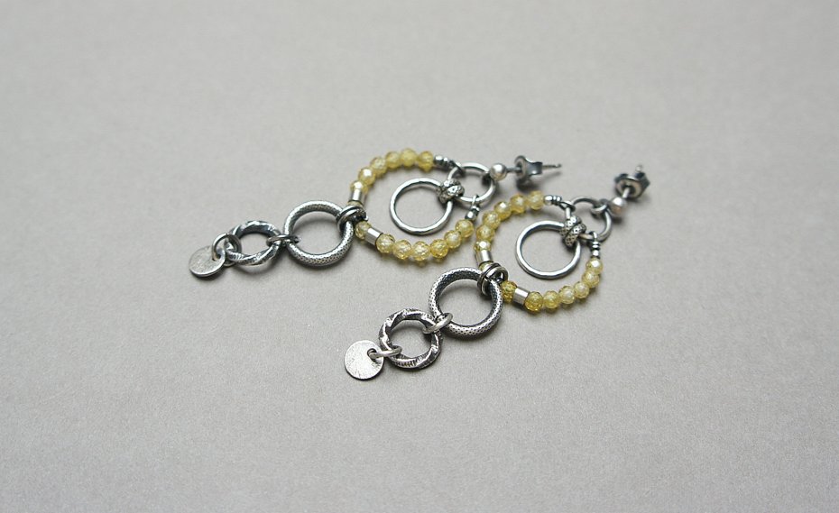 Kolczyki ze srebra [pr. 925] w połączeniu z różnej wielkości srebrnymi ogniwami oraz cyrkoniami [3mm]. Srebro oksydowane i przetarte. Całkowita długość kolczyków 6cm. Biżuteria ozdobnie zapakowana.