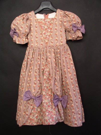 Suknia dziecinna Pronuptia de Paris.Zapinana z tyłu na zamek.Odcieta w pasie.Rękaw krótki,ściągany gumką+kokardka+bufka.Dół marszczony z przodu doszyta druga warstwa na końcach ściągana kokardką.Podszewka biała z doszytą sztywną falbaną.Z tyłu kokarda,Stan dobry.Długość 84 cm,pod pachami 66 cm,pas 62 cm.