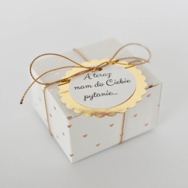 Pudełeczko białe w złote serduszka, ze złotym sznureczkiem i etykietą.