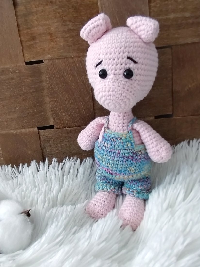 Szydełkowy prosiaczek w zdejmowanych spodniach to urocza zabawka dla każdego malucha.
