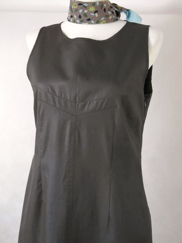 Kolor trudny do określenia - ciemno oliwkowy brąz.Ciekawy materiał, lekko sztywny i delikatnie mieniący się.Z przodu u dołu oraz z boku suwak.