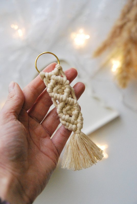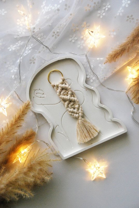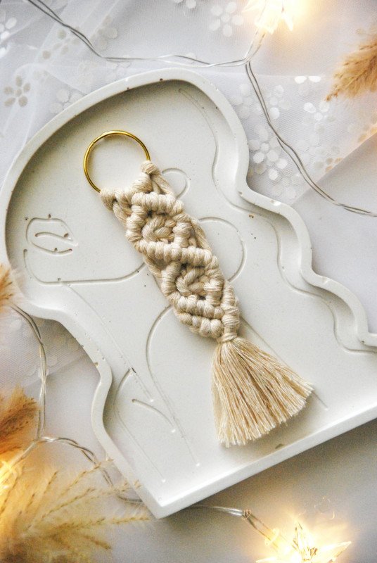 Dodaj odrobinę uroku do swoich kluczy, torebki lub plecaka dzięki temu ręcznie plecionemu breloczkowi w stylu boho. Wykonany z miękkiej, bawełnianej nici w delikatnym odcieniu ecru, zachwyca oryginalnym splotem i dekoracyjnym chwostem.