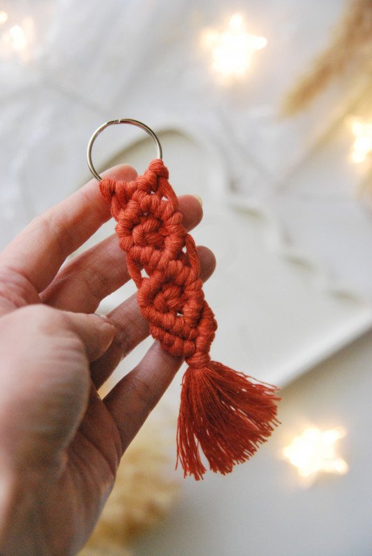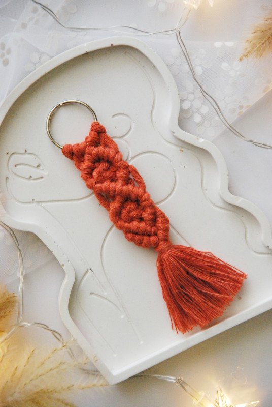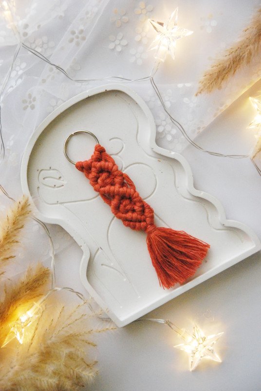 Dodaj odrobinę uroku do swoich kluczy, torebki lub plecaka dzięki temu ręcznie plecionemu breloczkowi w stylu boho. Wykonany z miękkiej, bawełnianej nici w delikatnym odcieniu rudości, zachwyca oryginalnym splotem i dekoracyjnym chwostem.