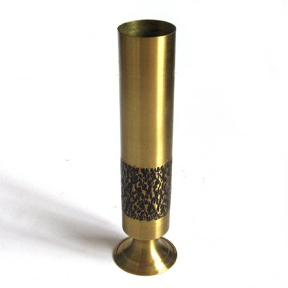 Niesamowicie oryginalny, prosty wazon, wykonany z mosiądzu.Na grubej nóżce, ozdobiony niewielkim wzorem na dole. Piękny na pojedynczego kwiatka lub niewielki, okrągły bukiecik:)