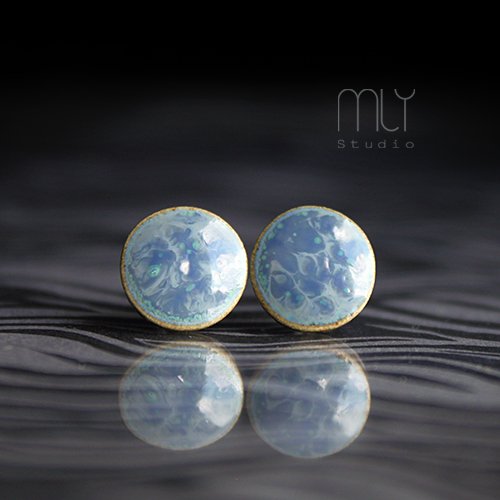 Ceramiczne kolczyki w formie sztyftów, ręcznie wykonane z delikatnej gliny kamionkowej, jednostronnie szkliwione mieszanką szkliw w kolorze błękitu i zieleni , z efektem plamek, na antyalergicznych sztyftach w kolorze srebrnym. średnica ok. 9mm.Polecam